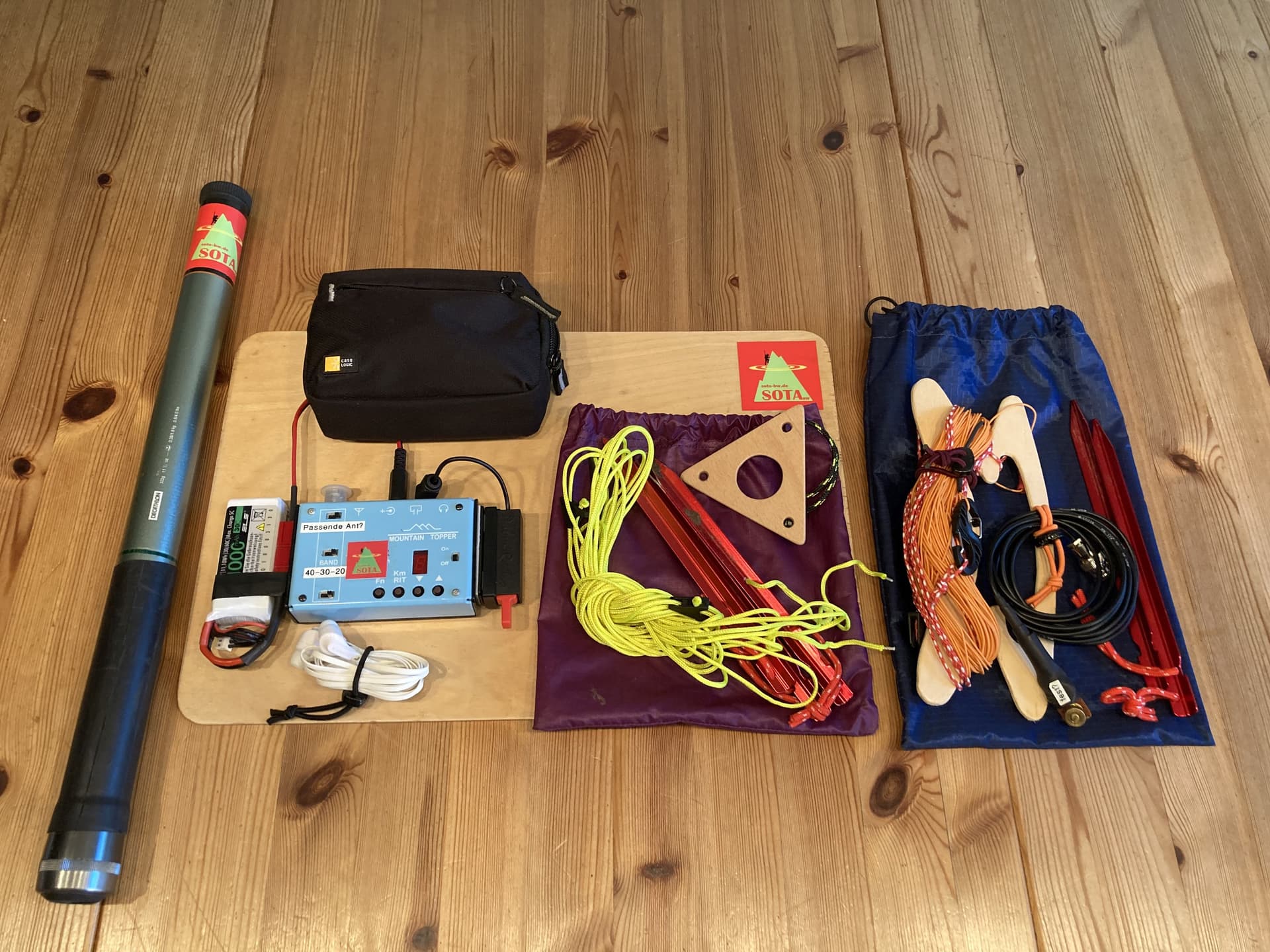 I’ve already made some improvements: Bulldog paddles (63g including cable) that clamp on the side of my clipboard; shorter ropes included in each dipole kit; yet another (even smaller) dipole kit (sometimes I want to put up two antennas for the same band and compare them); and a smaller backpack (29 liter?) once I get the straps resewn.