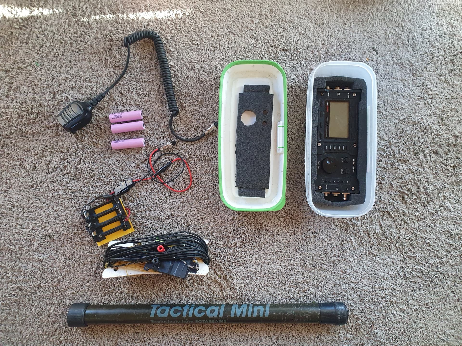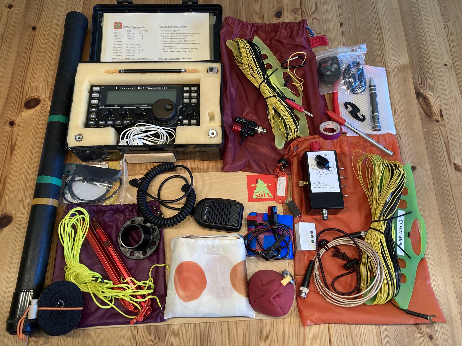 1. If weight, space and time are cruical, I’ll take the “light” setup: QCX (20/30), two loading coils, two sets of radials, approx. 4 watts. Together with a padded box for the radio and a protective tube for the antennae, it weighs 790 grams. Not super light but ok for me. Perfect on restricted summits, QRV in 1-2 minutes.
