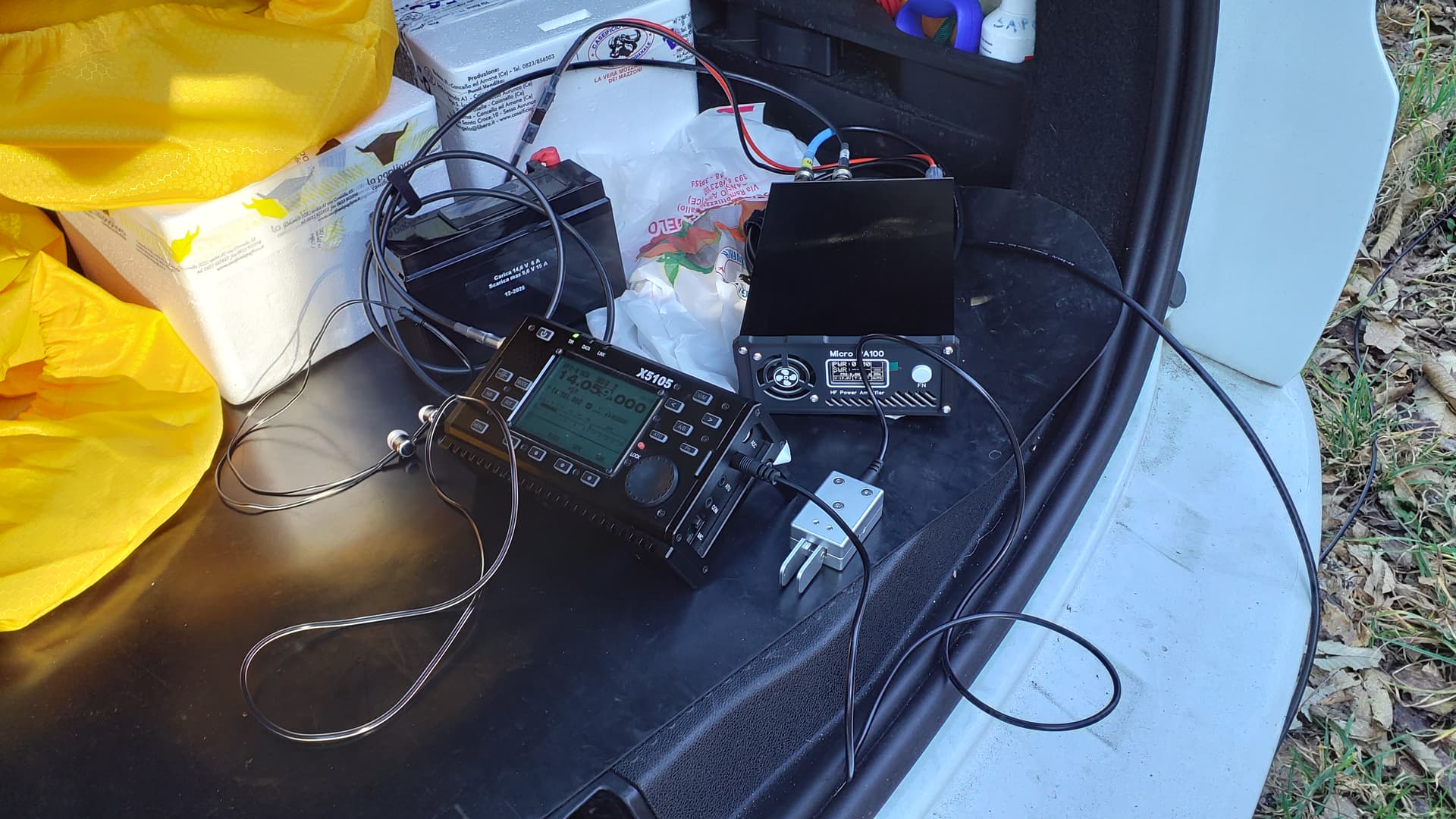 I used the XIEGU X5105 + MicroPA 100 (100 W) with a 5.2 m vertical whip antenna and four resonant radials .