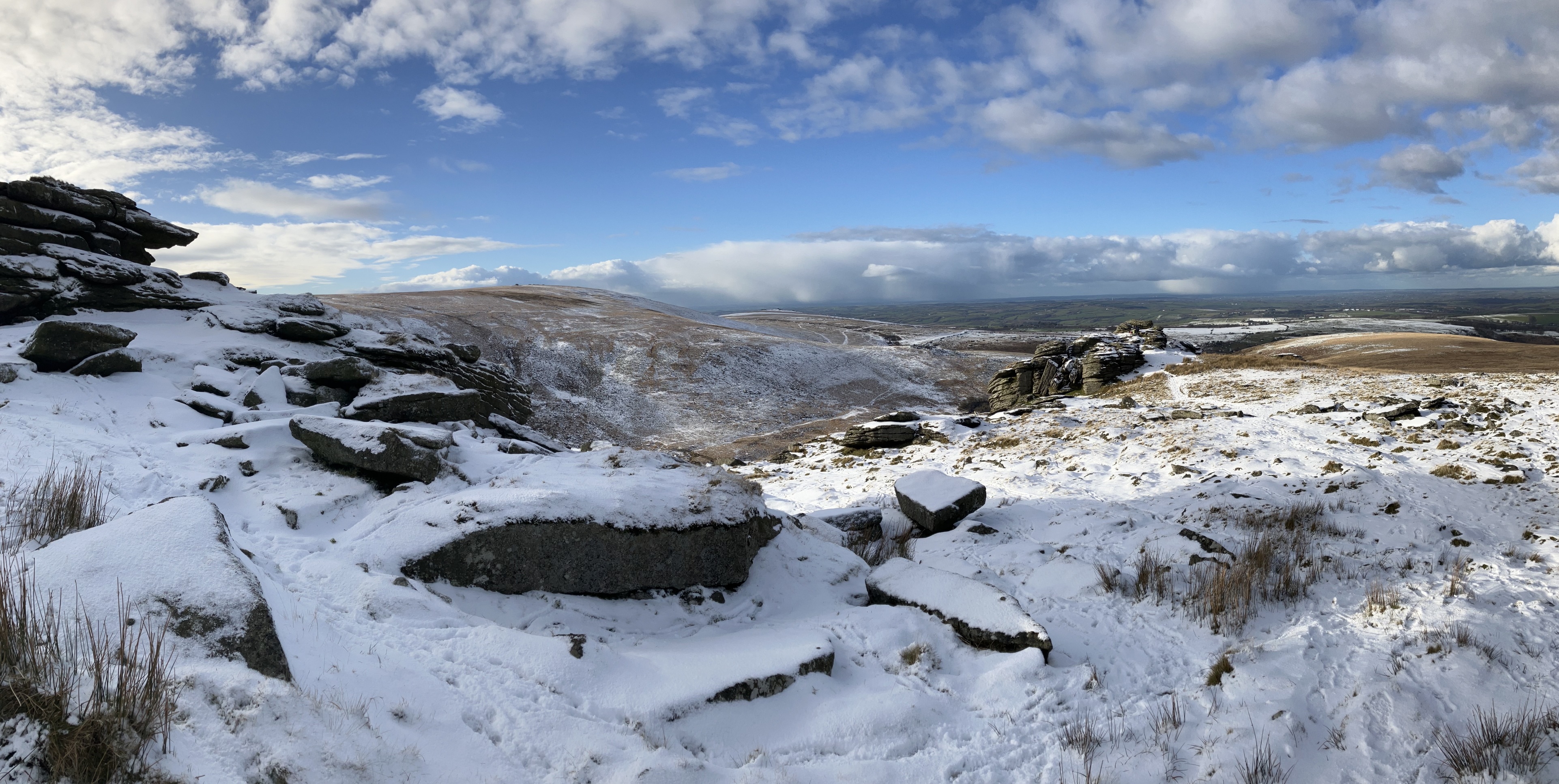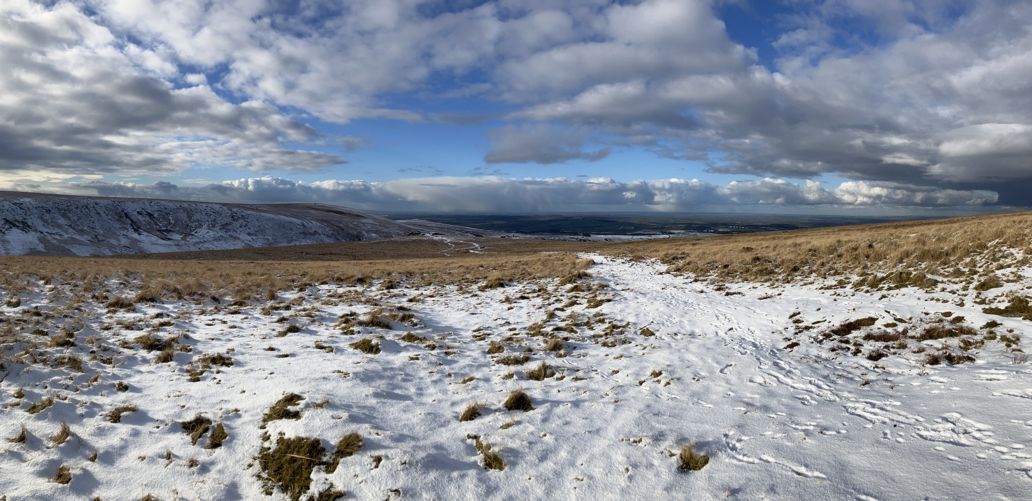 A gorgeous, sunny morning. I arrived very close to the Meldon Reservoir car park and the road was covered with compacted snow. There’s an ascending corner (just after a bridge). The car wouldn’t go up it, so I decided to go back and park in the lay-by that I had just passed…