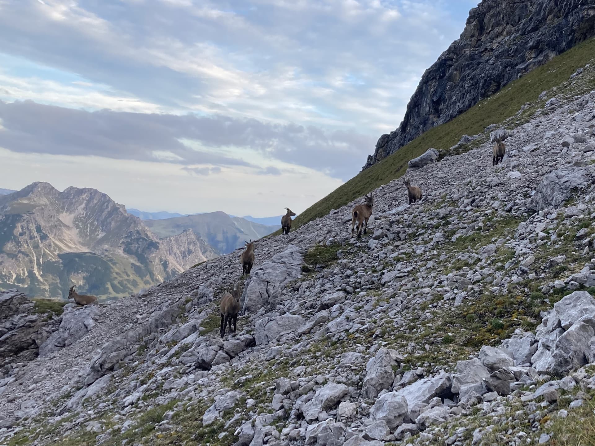 The silence and the crisp air were marvelous when I made my way up the steep scree field. It was maybe ten minutes after I left the hut when all of a sudden I met a group of alpine ibexes ![]()