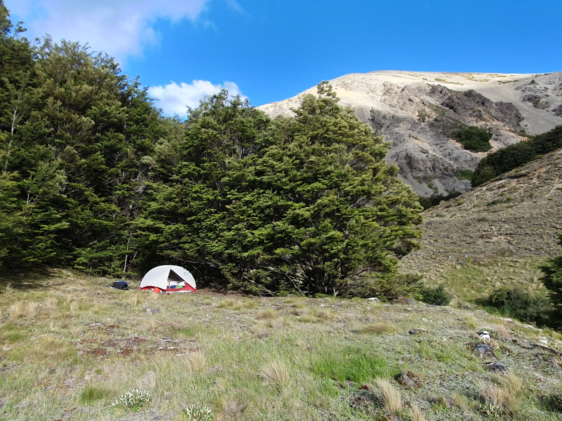 A final scree decent into bush at the outlet of Rag and Famish creek for a sheltered camp for the night