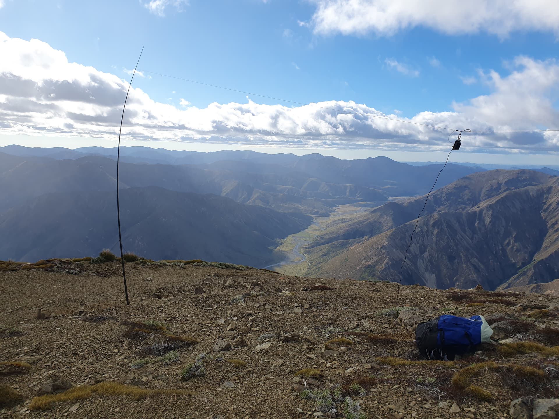 The wind is 60kph, gusting to 140kph on Mt Seymour [ZL3/CB-323] - ground-hugging being the only option if you wish to stand on the exposed ridgeline. We drop back to the more sheltered SE slope, but the gentle curve of the summit offers little shelter. Despite erecting the mast to only half-height, I still have to repair 2 breaks of the antenna wire before accumulating the required 4 contacts to make an undignified, hasty scuttling exit down scree spurs towards Fowlers Pass