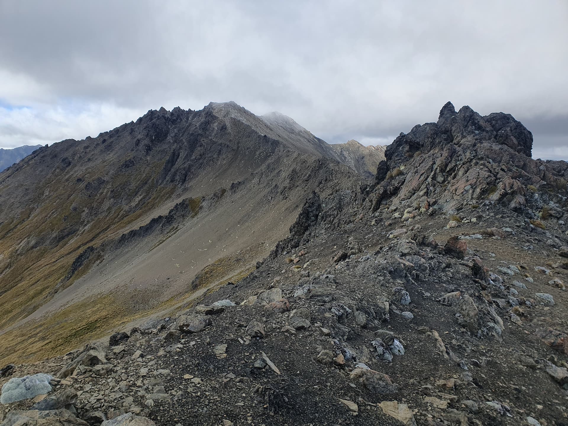 Beyond Crimea Range the tramping becomes more straight-forwards, with broad scree-and-tussock ridgelines leading to Sebastapol Ridge [ZL3/CB-232]