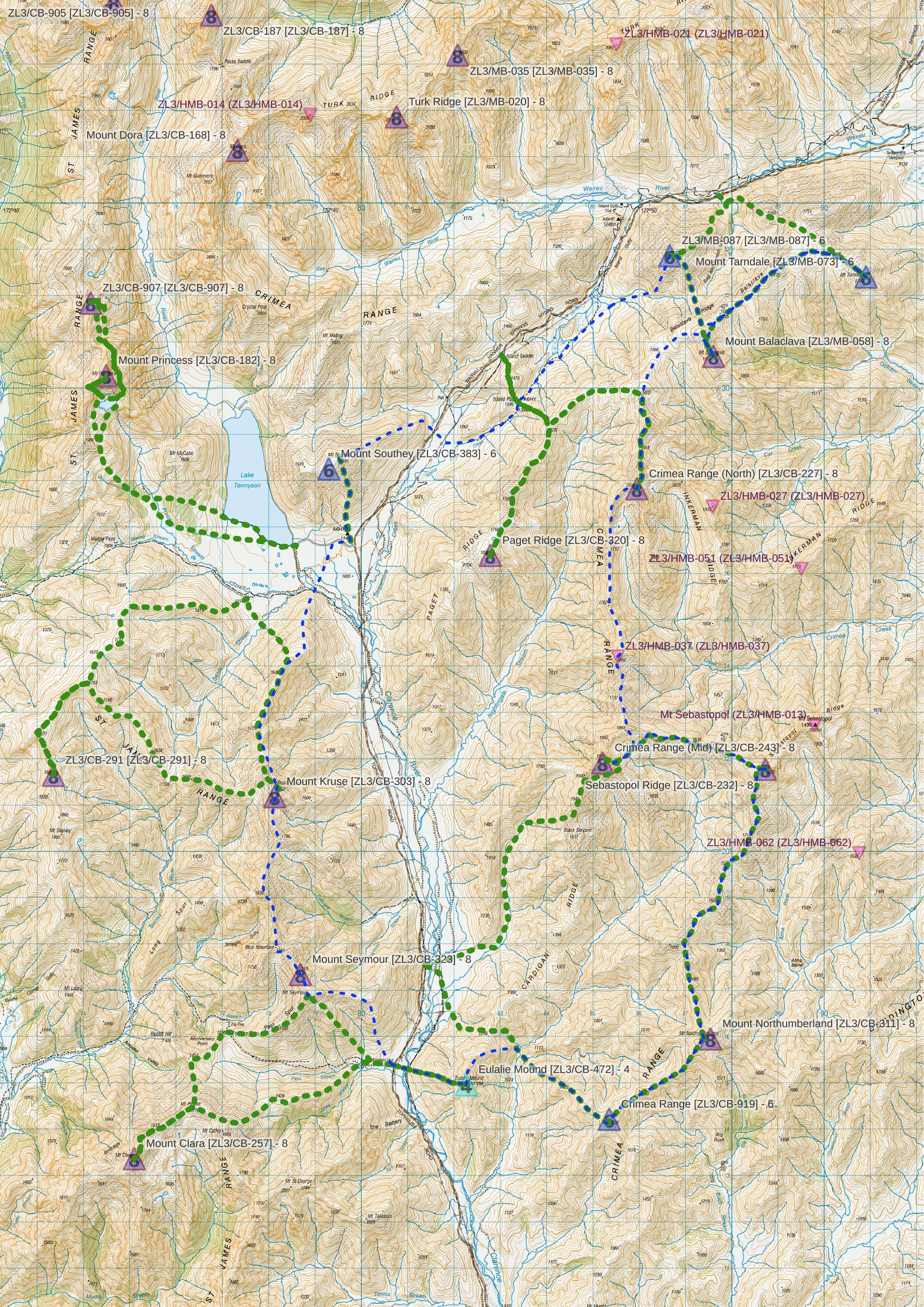 - The nice rounded scree mound you can see from the road is not Crimea Range (mid) [ZL3/CB-243]. The actual summit is hidden behind, unapproachable from the south, and requires a full circumnavigation to the NE spur to be climbed.