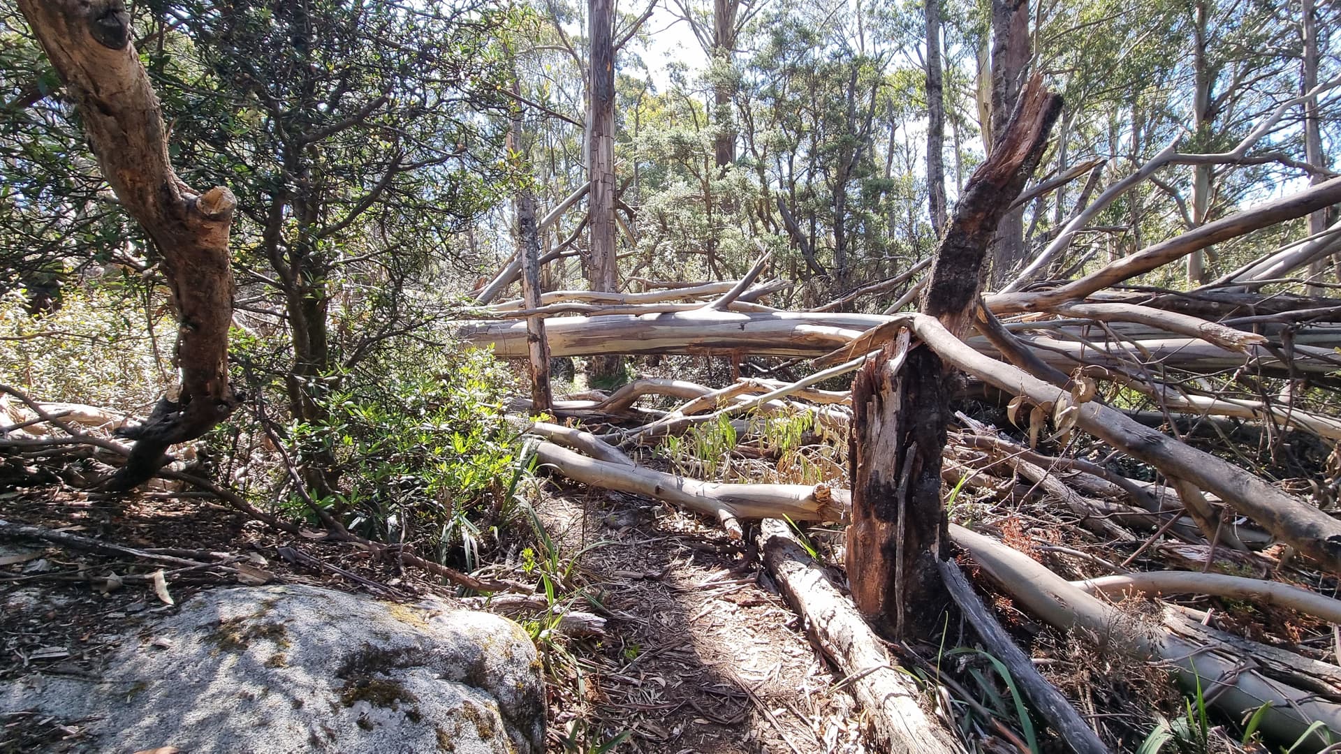 I left the car at about 7:50 AM and arrived at the summit at 10:25 AM. The track up is a narrow path through a mixture of trees including Mountain Ash, Silver Wattle, and Snowgums. A bit of limbo gymnastics was required on a couple of occasions.