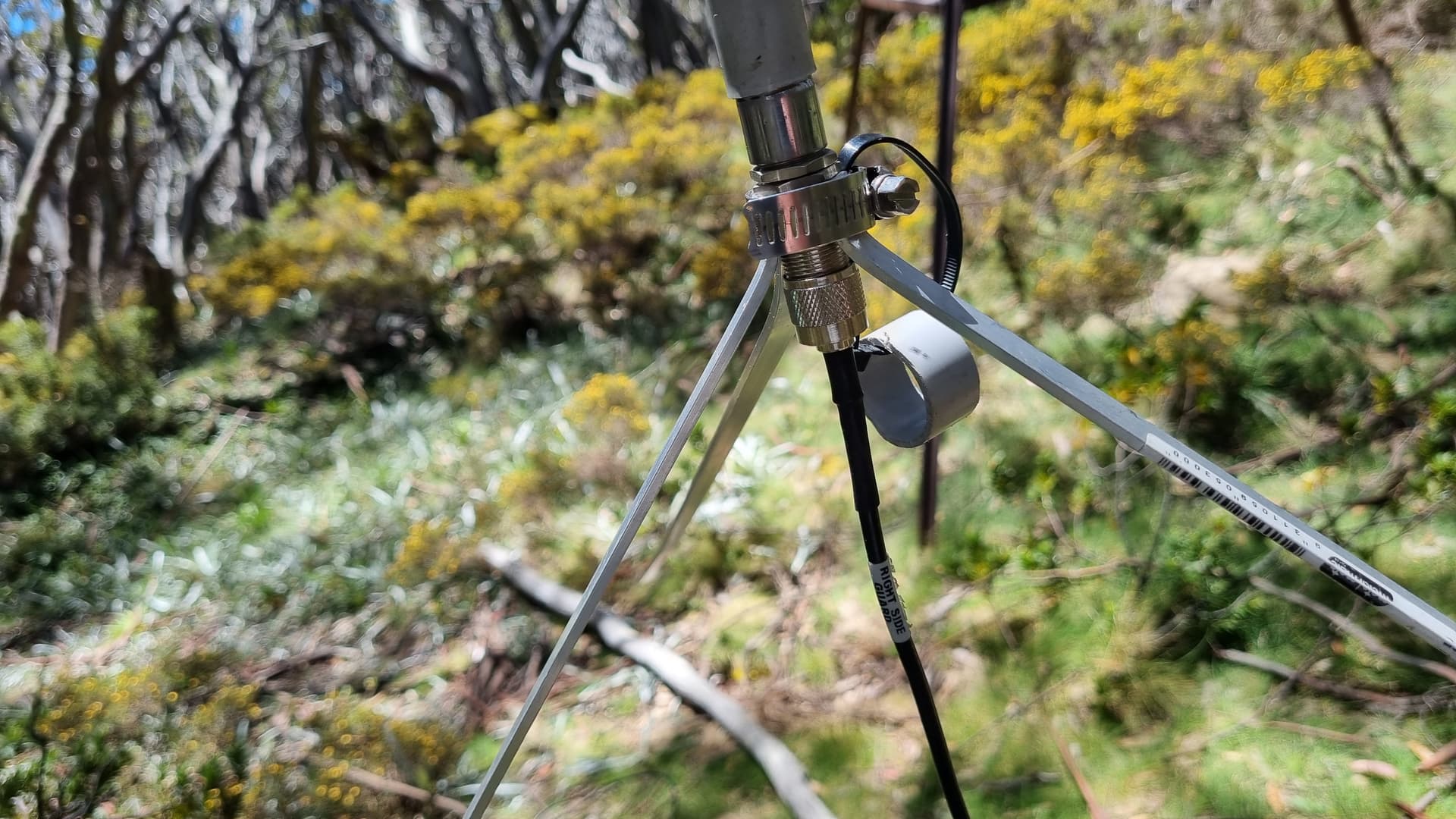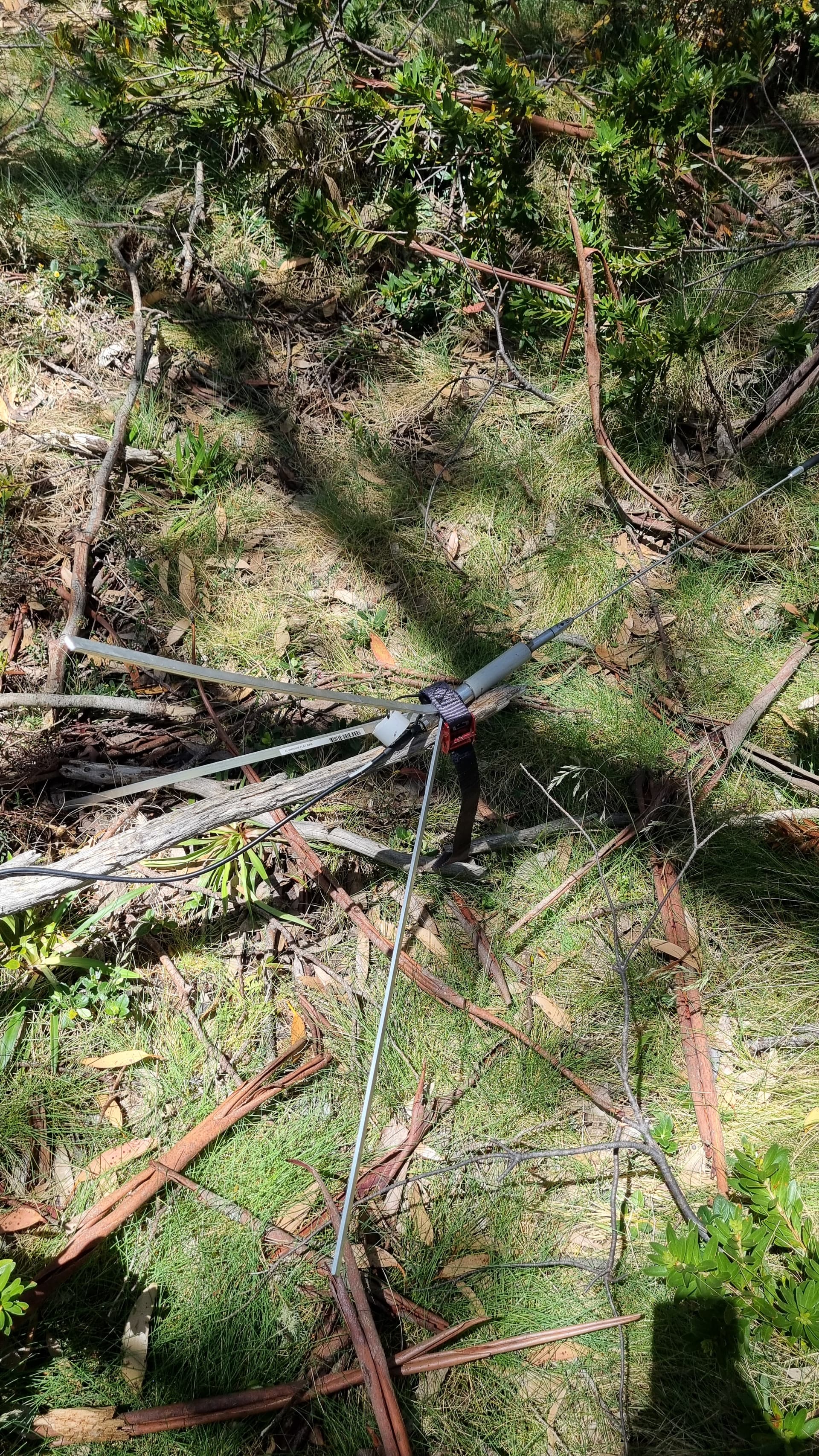 After qualifying the summit for 2026, I packed away the Inverted L and set up a 2m/7cm droopy ground plane antenna. The antenna was made with a Diamond dual band antenna, that normally resides on my car, three lengths of 10 x 3 mm strip aluminum, an SO-239 joiner and a stainless-steel hose clamp. All this was strapped to a fallen branch, that was then strapped to the trig point.