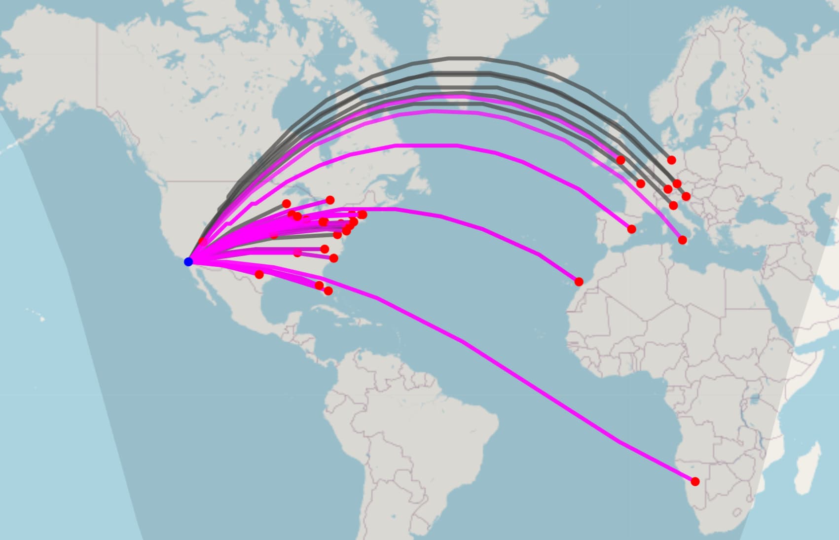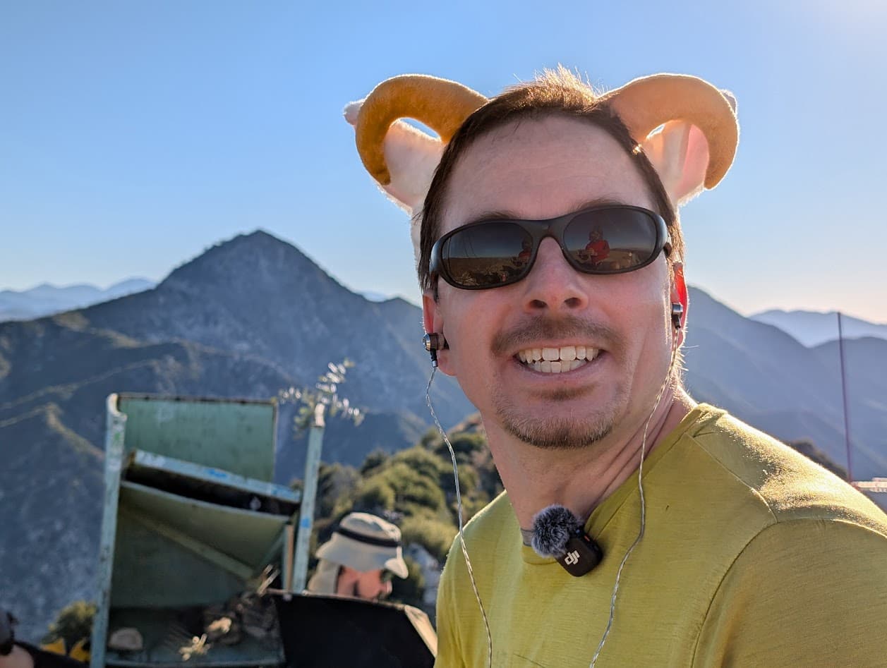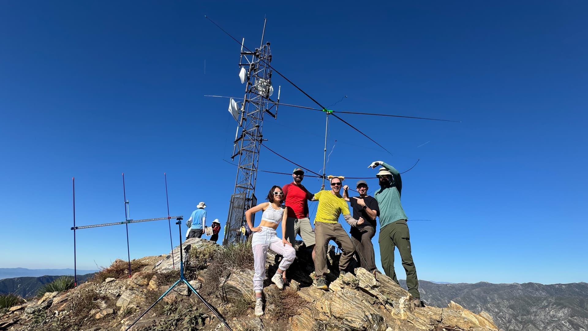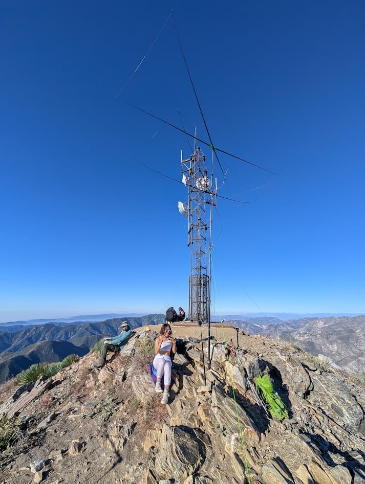 I started my day early, departing San Diego, California around 3:15 am local time to drive 2 hrs 15 min to the Josephine Peak (W6/CT-025) trailhead just North of Los Angeles. With over an hour until sunrise, I started hiking by headlamp, my pack heavy with an Elecraft K3, 12 Ah battery, 25 ft mast, and homebrew 10 m and 15 m Moxons. The hike follows a dirt road up about 6.5 km and 600 m of elevation gain to a small summit that drops away steeply in all directions. Ara (N6ARA), Mark (KD7DTS), Di (KO6BTM), and Devin (W6DVN) were about 40 minutes behind me which meant I would have time to set up my station and operate a bit before they arrived.