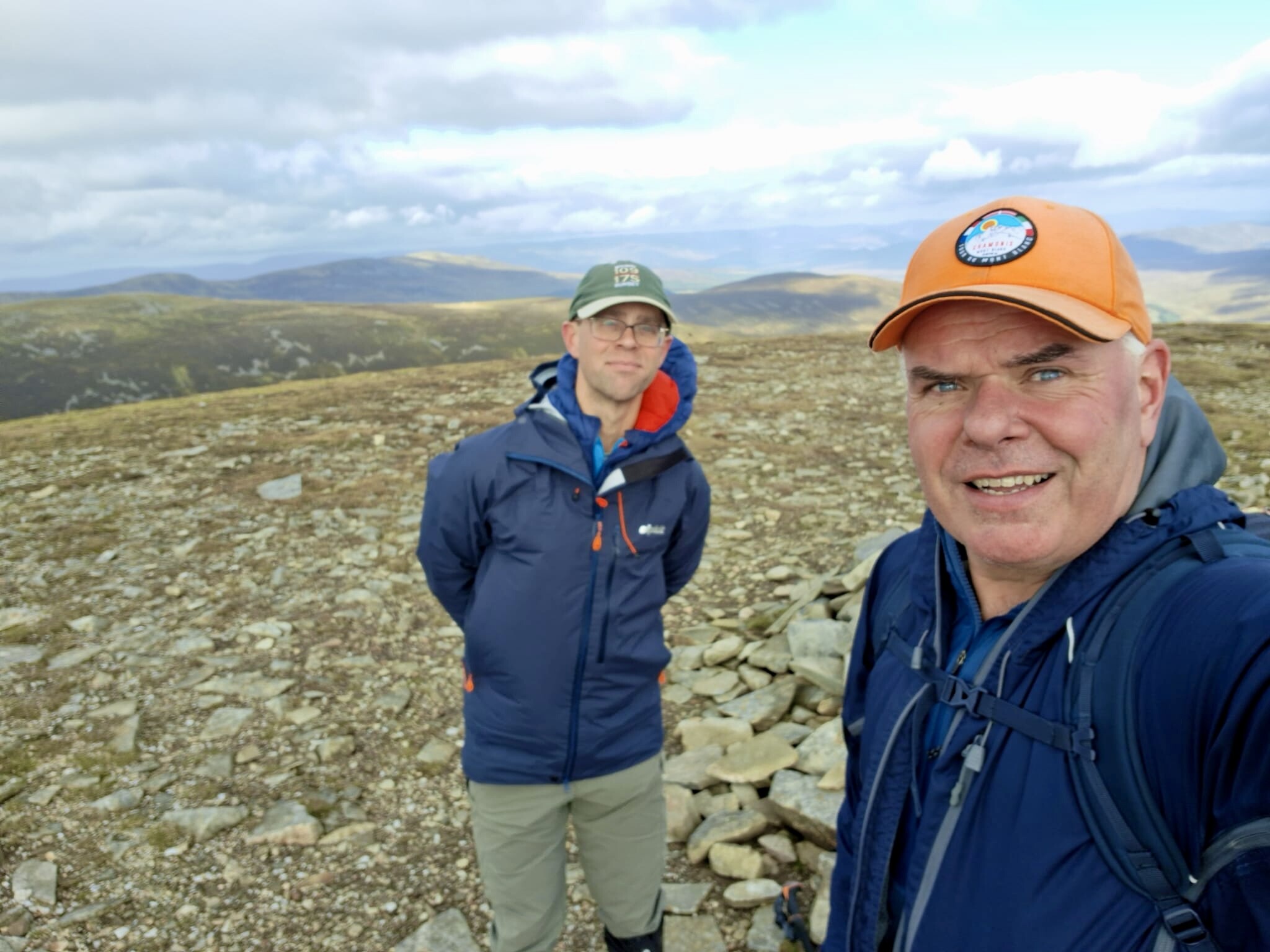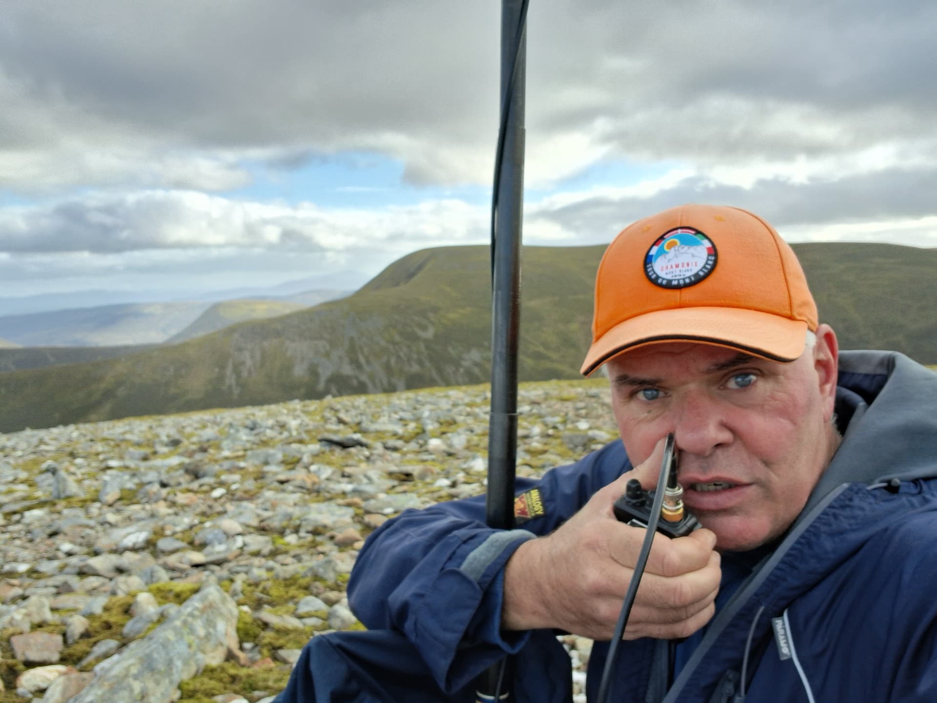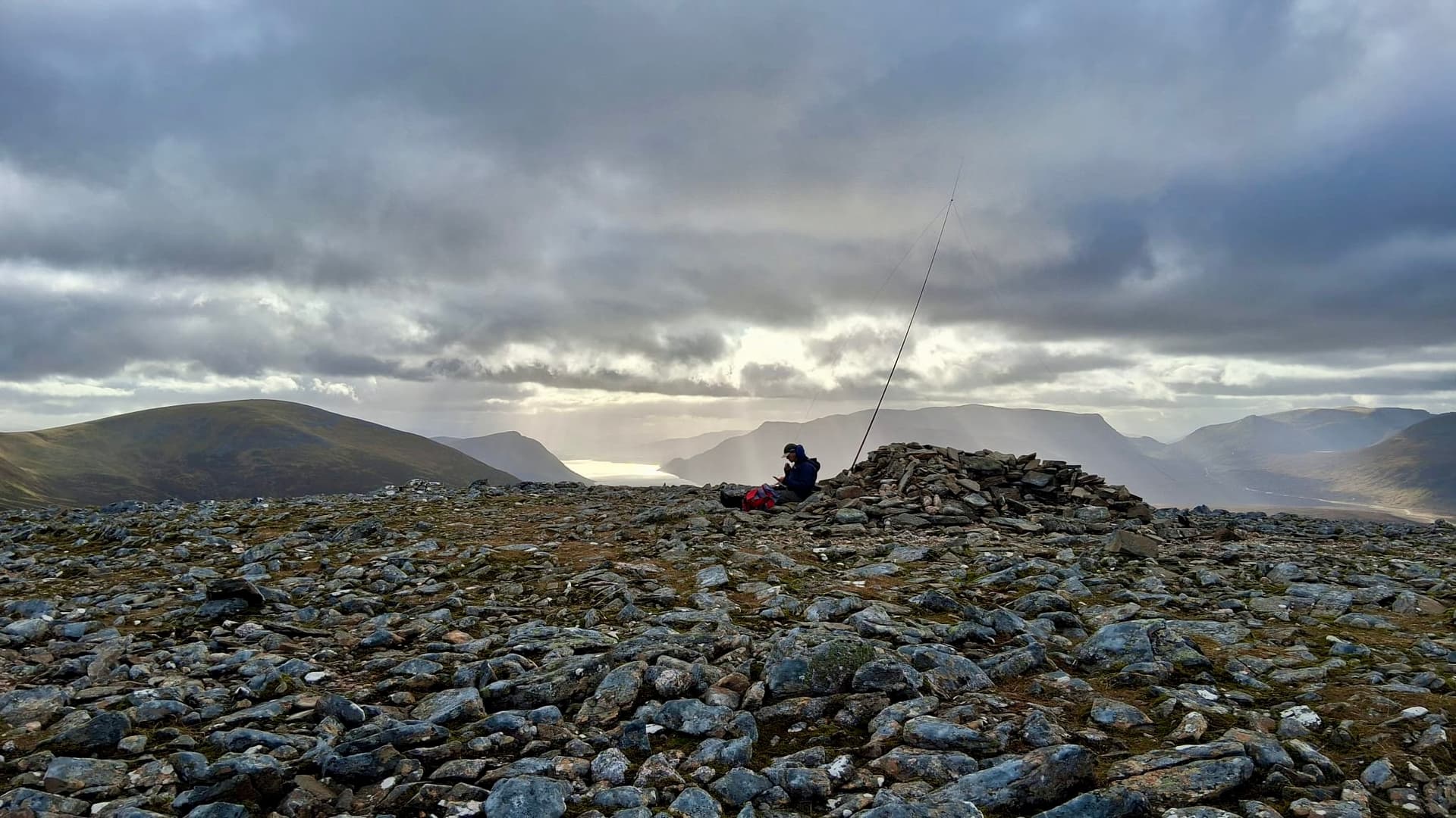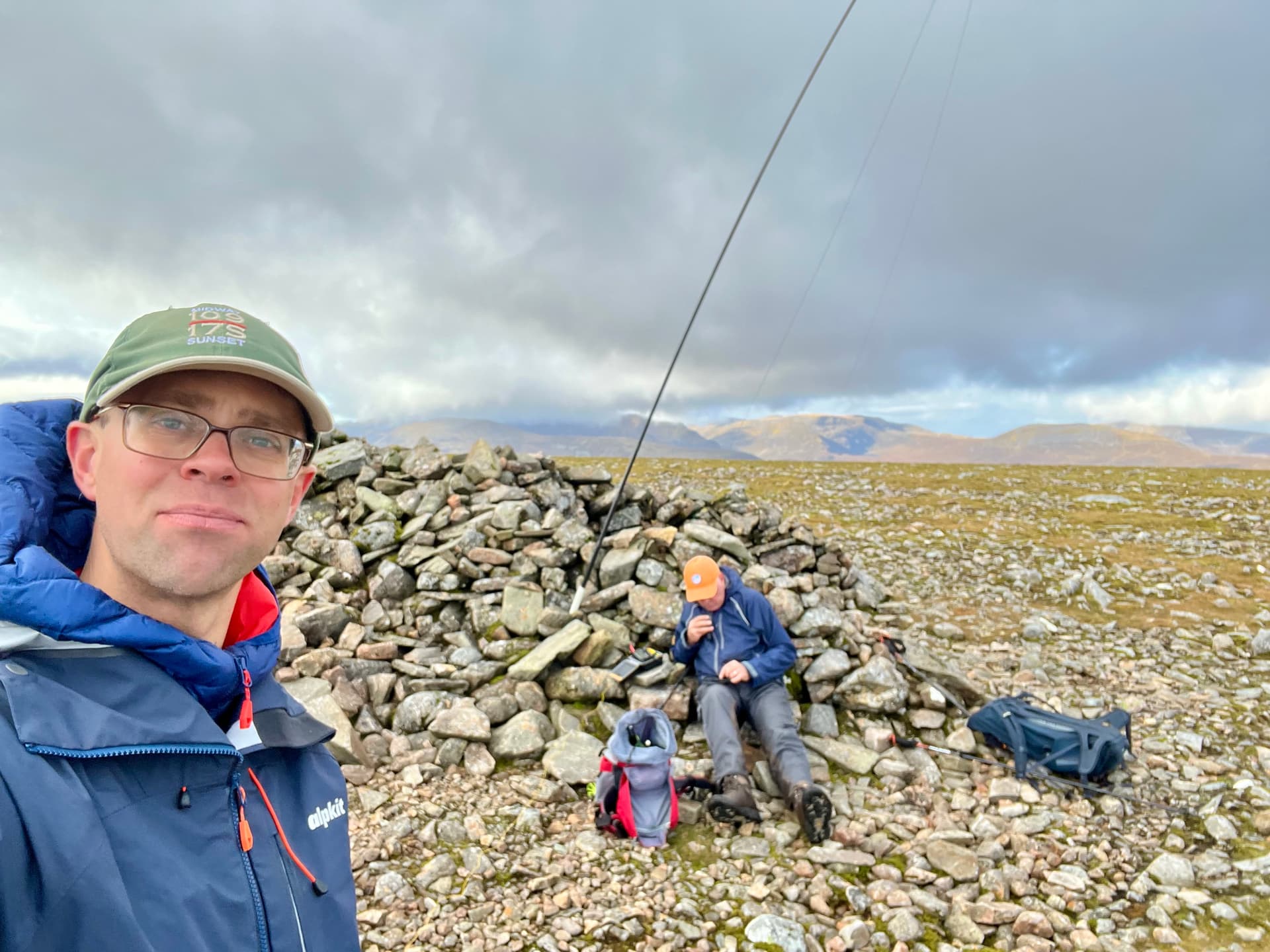 Now we’re on the main munro loop, the track was clear and wide to the summit of the highest peak of the day. At 1,010m it just sneaks into the 8-pointer category. After using my radio for the previous two summits, Fraser was determined to use his own gear this time. A QMX plus a new EFHW for 20m. I left him at a post to setup whilst I went up to the summit cairn.