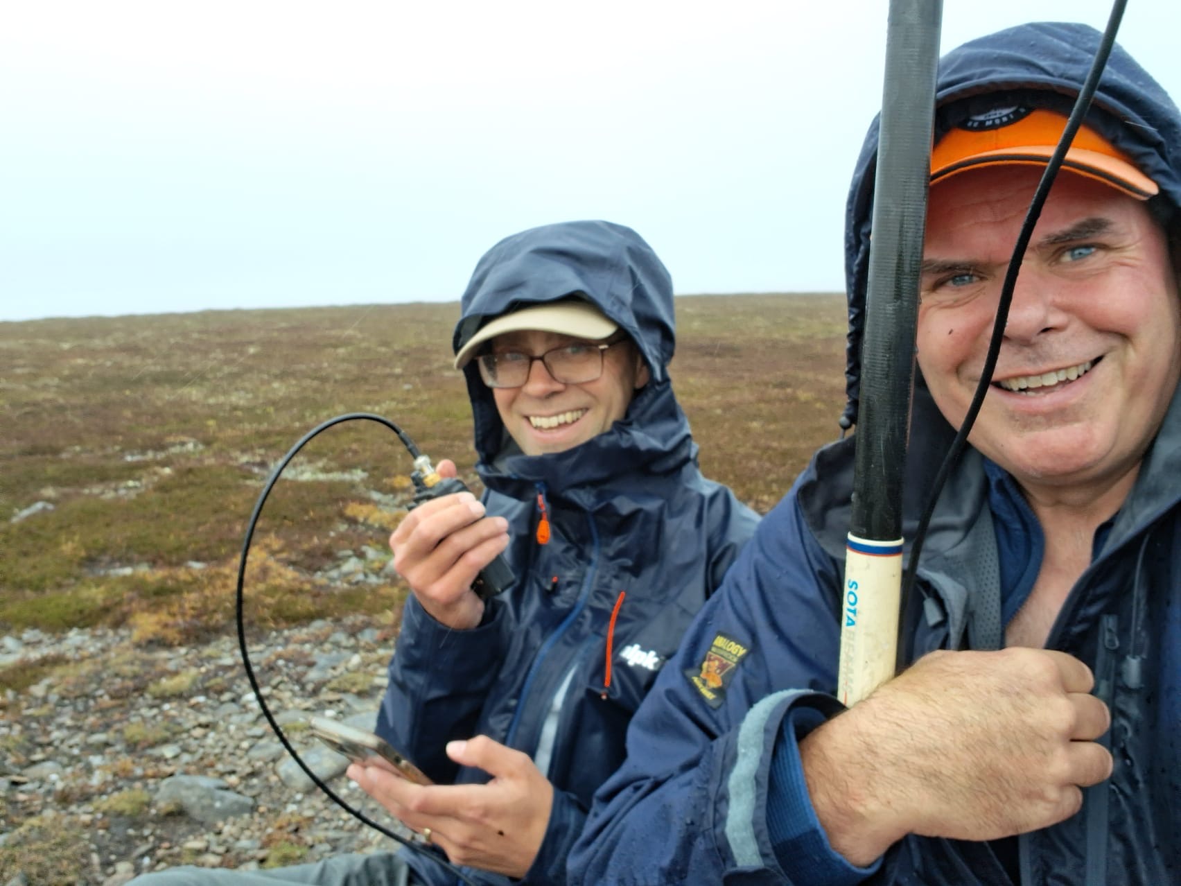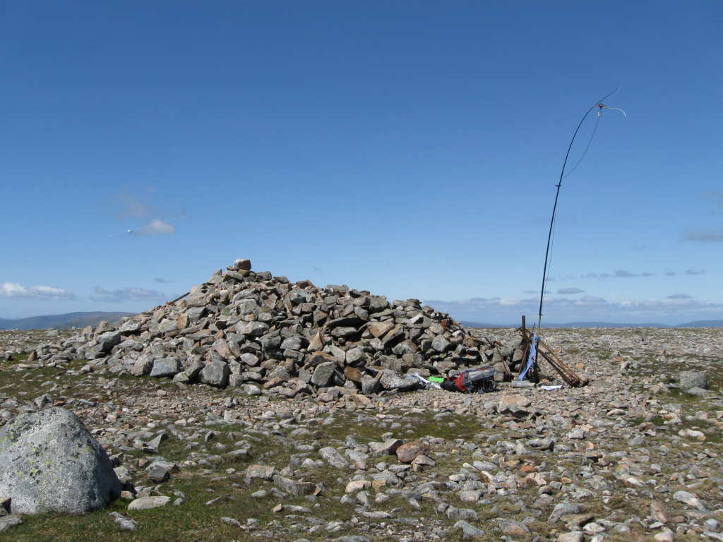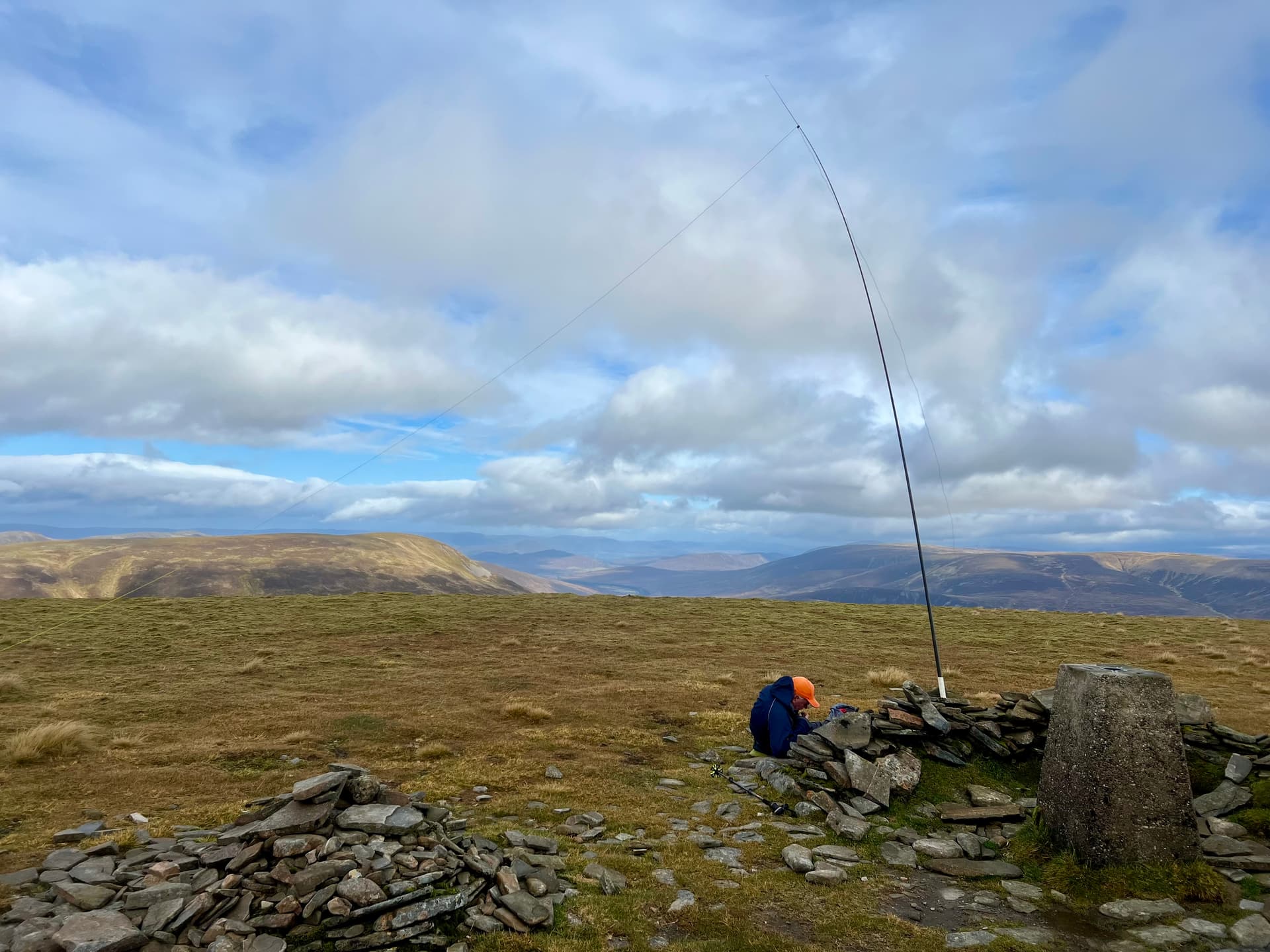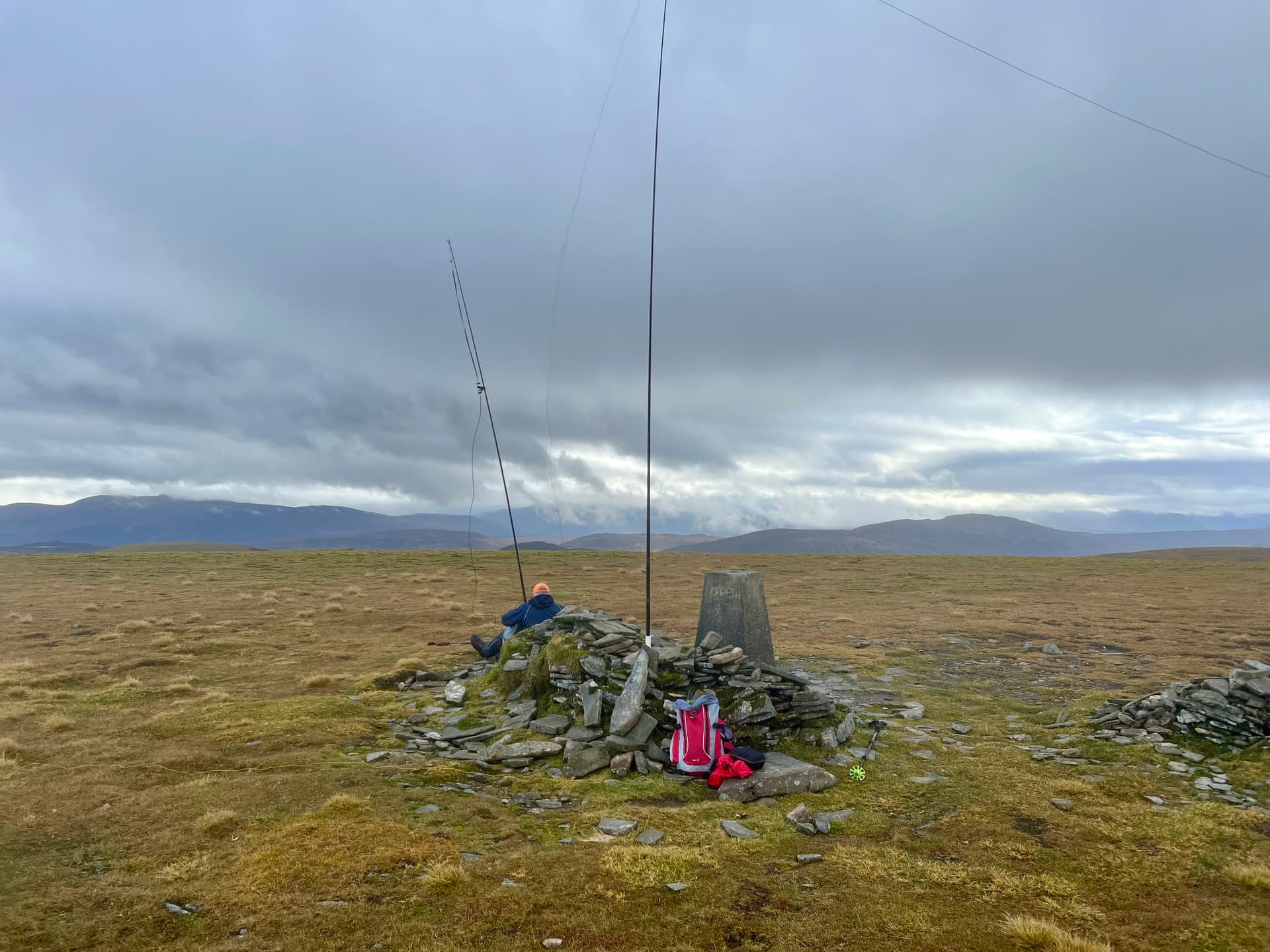 With a wee cairn at the top, there’s not much shelter. Hoping for a quick activation, we decided to share the HT and try 2m. After several CQs with no response, it was clear HF was going to be needed. Whilst Fraser continued on VHF, I setup HF and we managed to get enough contacts on 40m each before making a hasty descent off the summit.