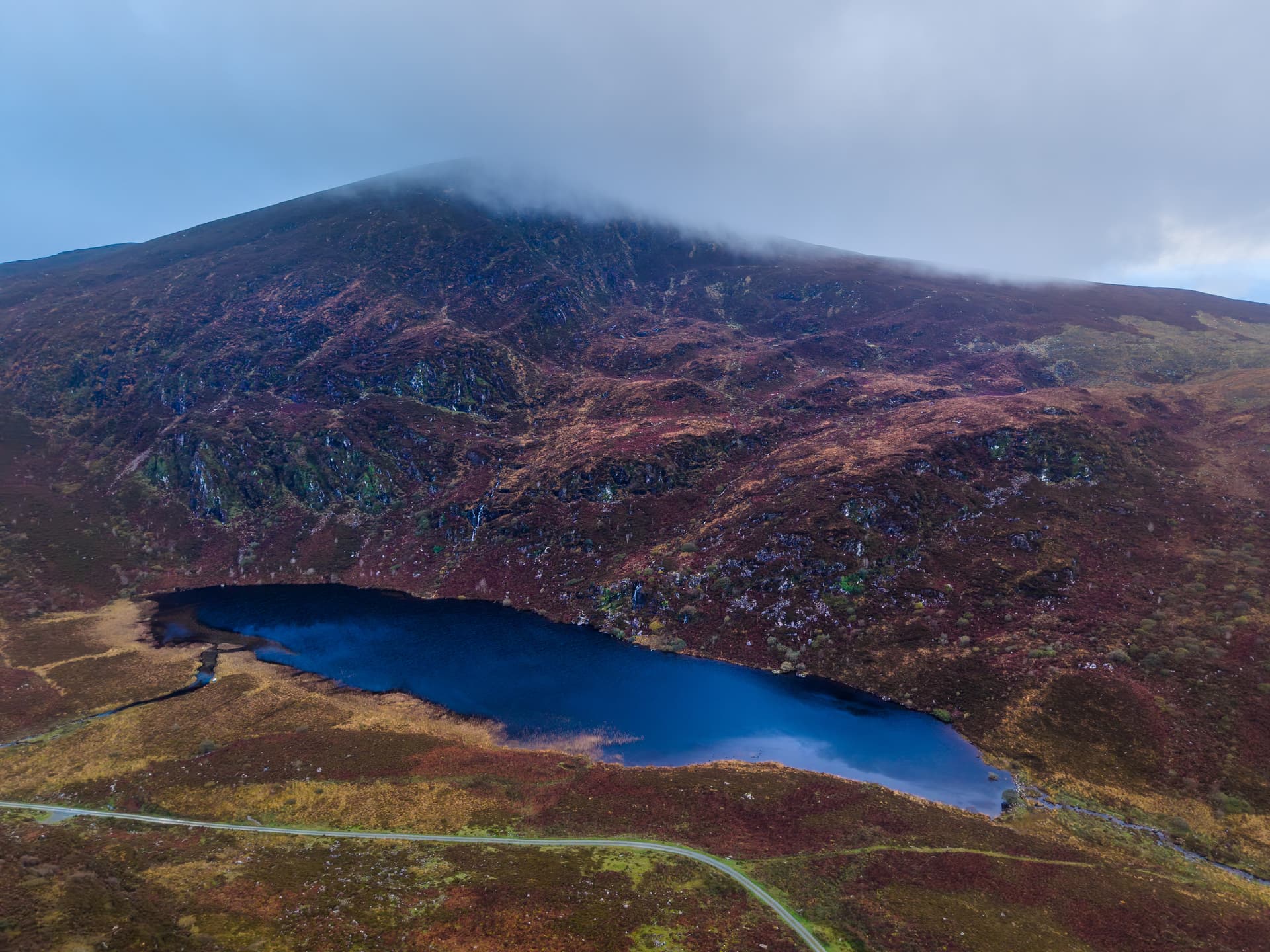 I went back to my car, this time following the AllTrail route — the trail which doesn’t really exist — and started changing to dry clothes. What a relief! Exactly every part of my attire was wet. I poured water out of my Salomon boots which were supposed to be tough mountain hiking and water-proof shoes. Then I flew the drone to review and record that initial steep heathery climb for whoever wants to attempt it in future, and also did a few flyovers of the Slyggudal Pass and the Shrone Lake (Lough Glannafreaghaun) which is so beautiful with its deep blue color against the Black Cliffs of the Paps East.