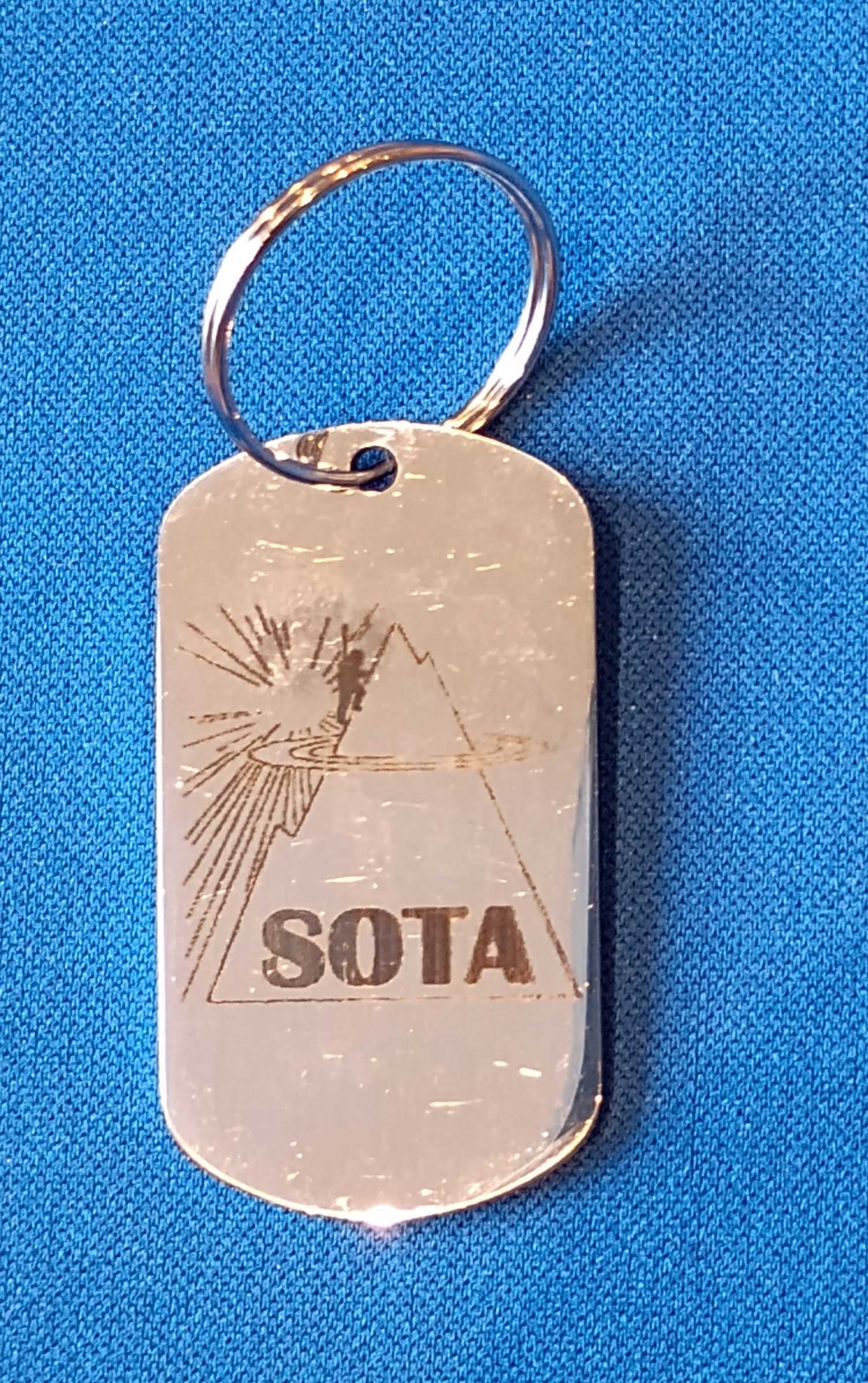 This a shiny keyring which is laser engraved with your call, name and the SOTA logo. The pictures show a CR2032 cell for size.