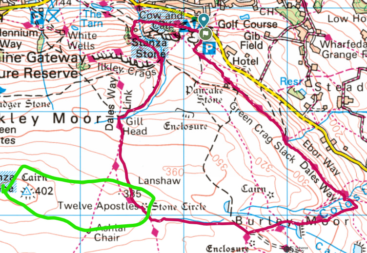 On Tuesday (14th) my wife and I would like to do a 7.7km circular route starting at Ilkley Moor car park and going via Cow & Calf, the 12 Apostles, and Stanza stone. I would like to do a 2m FM/SSB/CW activation of Rombalds Moor G/NP-028 (402m ASL) on route. I would prefer not to have to deviate much if at all from the walk.