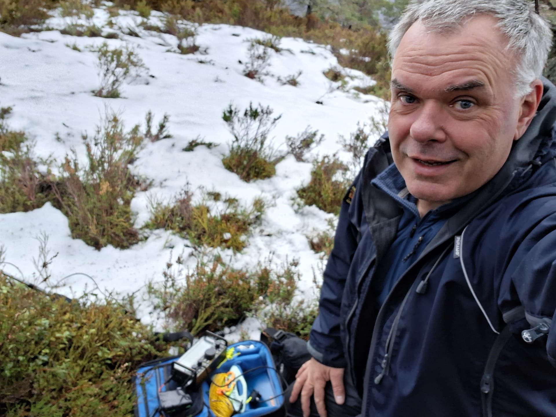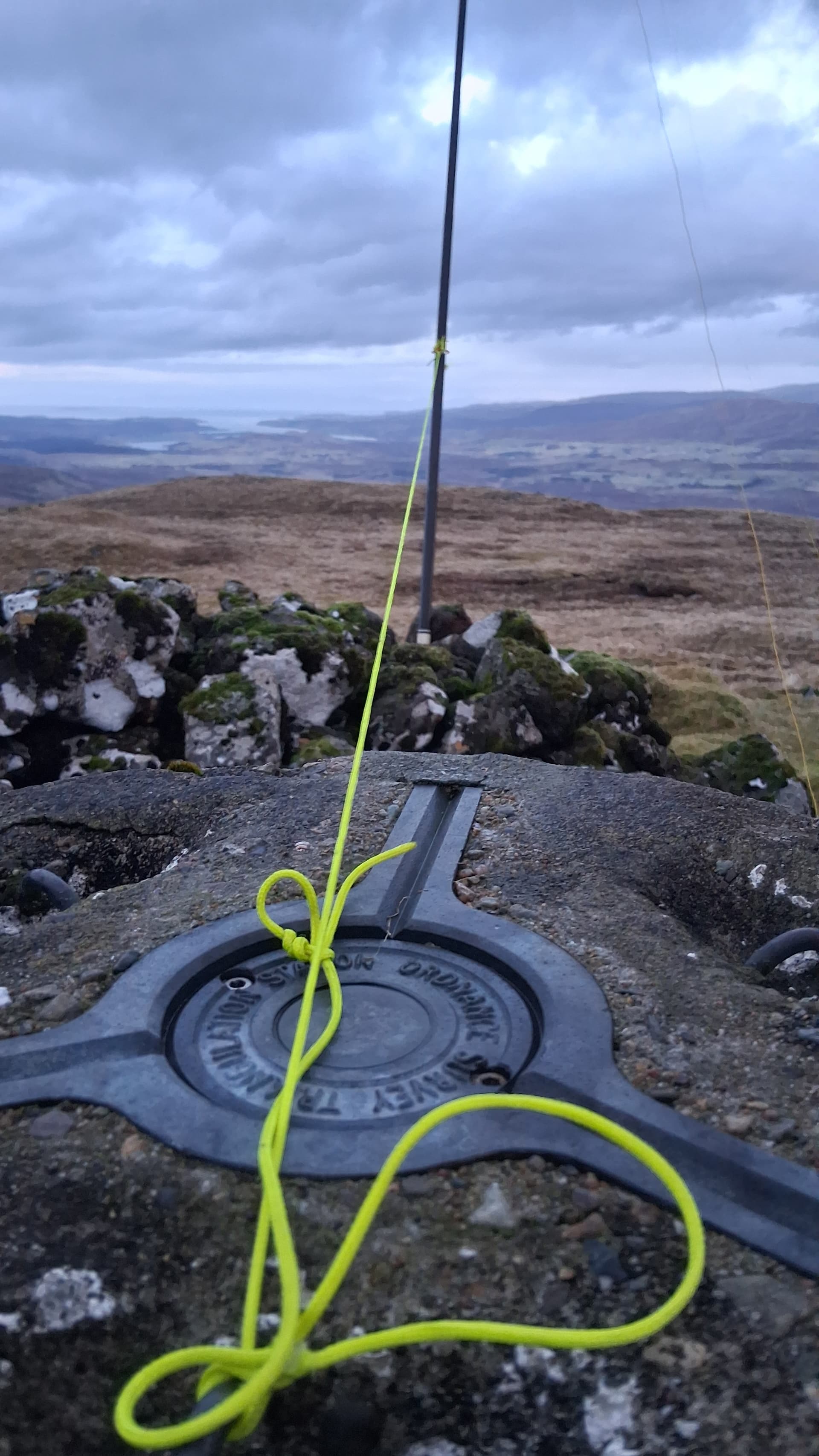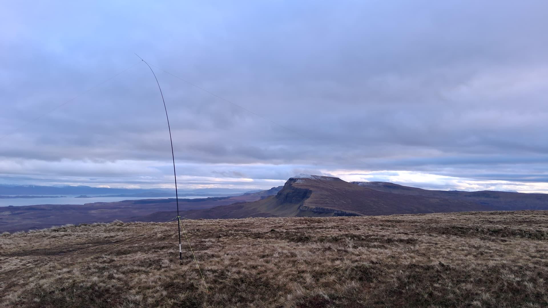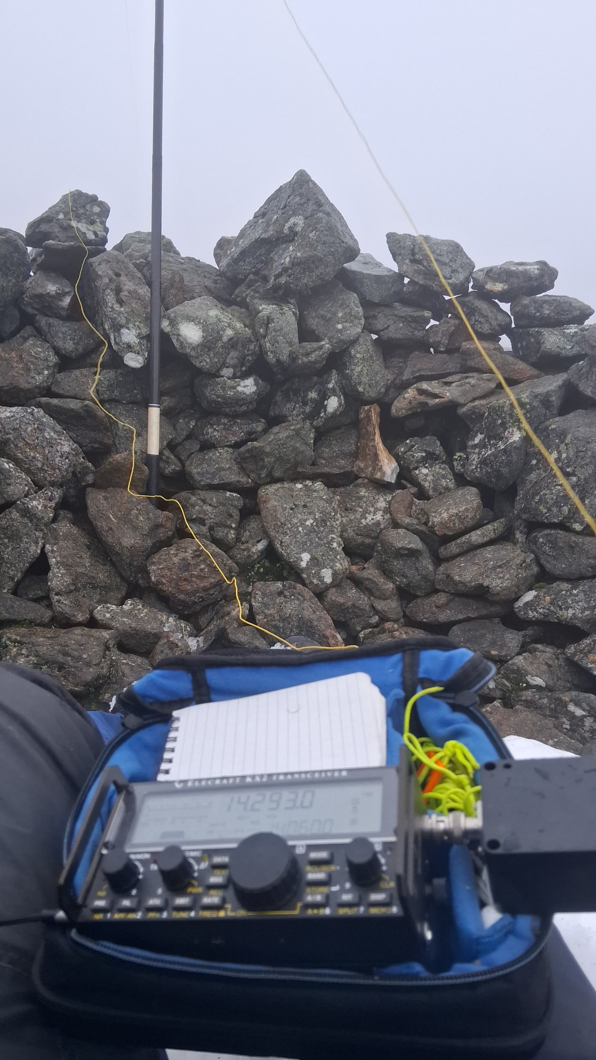 I was at the cairn for 1300 and set up VHF, using a slim-G on a 4m mast. Then, on to HF. The carbon 6 was extended around 5m, with the W3EDP strung vertical for 4m and then the world’s longest, lowest sloper for the remaining 21m. I’d rigged two masts in case I needed to get in my bothy bag. Once I was in, I did not plan on coming out. Anyway, it wasn’t needed in the end.