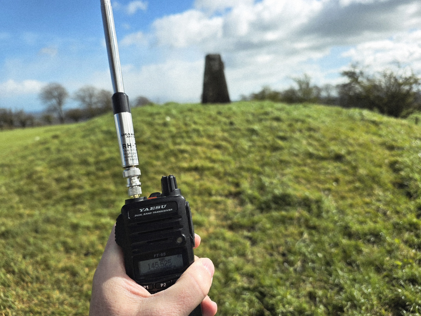 Yaesu firmly in hand, I made my way towards the trig once the hail and sleet storm had passed. There was more on the way so I didn’t even contemplate getting the KH1 out. Glad I didn’t now after ‘plumgate’. This would be 4 FM contacts and gone.