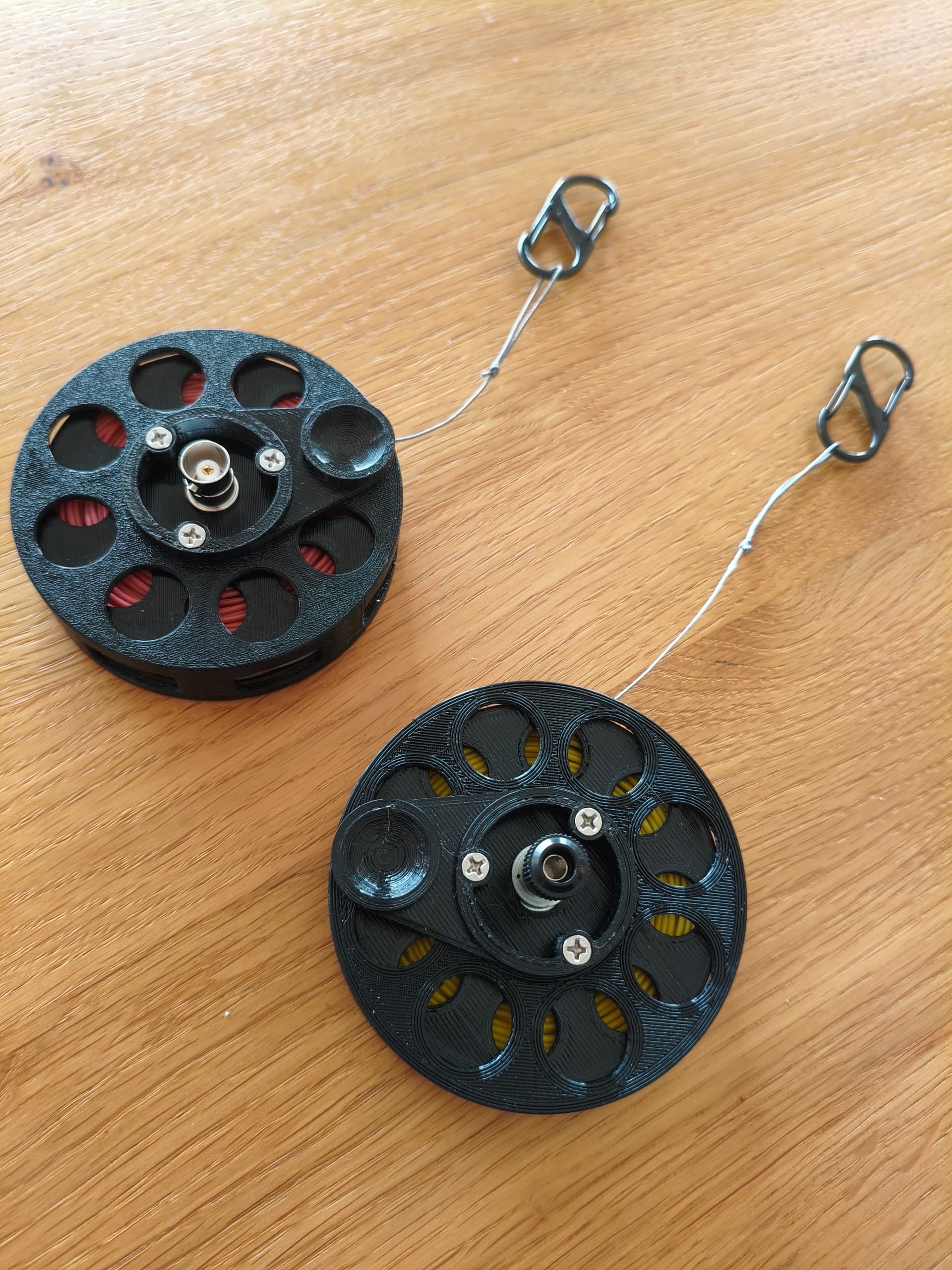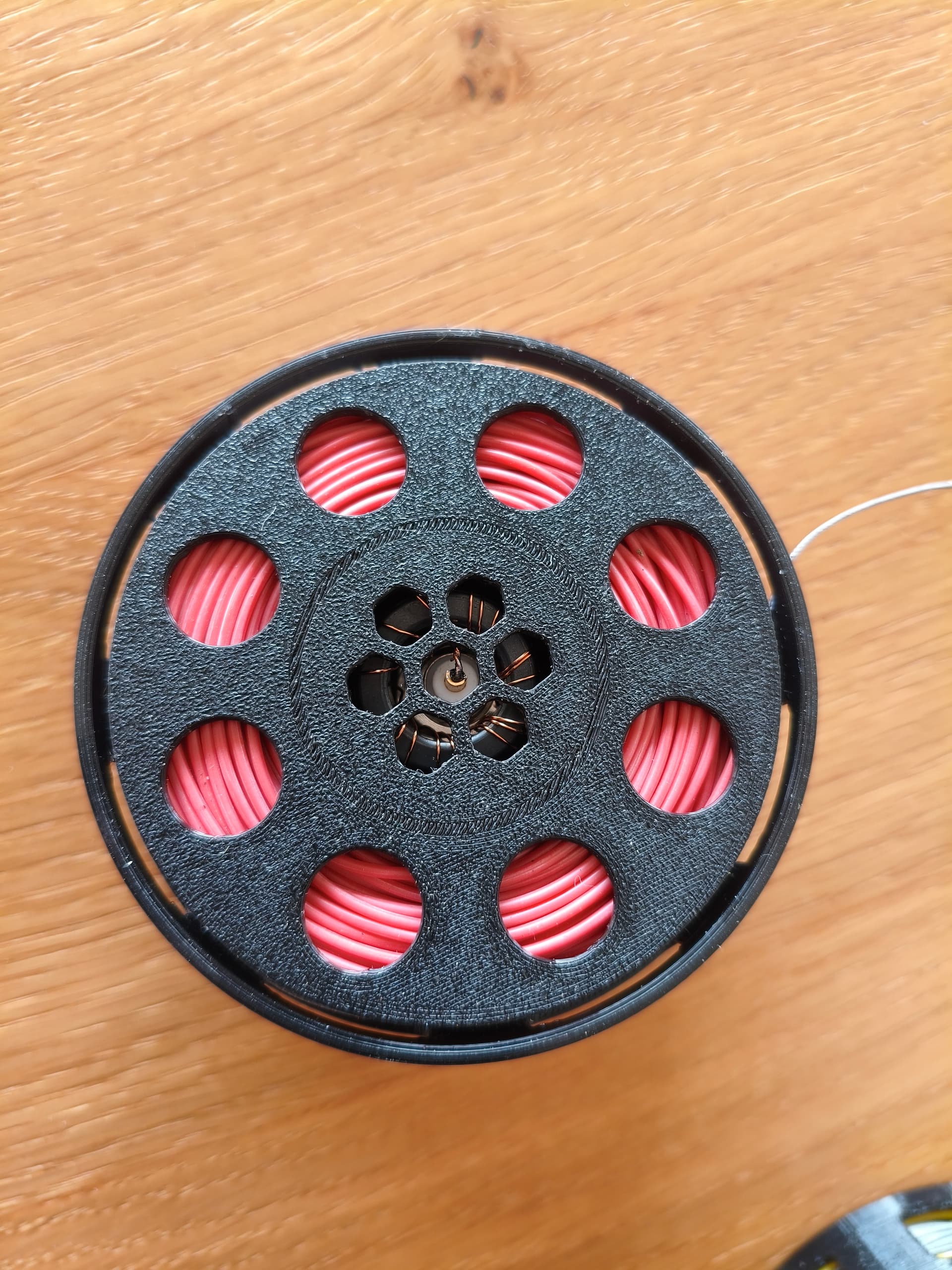 I put together two of these. One is simply a 21+m wire for hooking up directly to the L-match; the other has a 9:1 transformer, and uses 5m RG316 as CP. Fits on the small spool if you use 28 wire. Both are quick to deploy and, more important perhaps, very quick to roll in. An benefit of this design is that you can adjust the length continuously, down to using it as a 6.5m vertical on a pole, by blocking the spool putting a hook through the holes (works well down to 30m with the L-match). 100g all in.