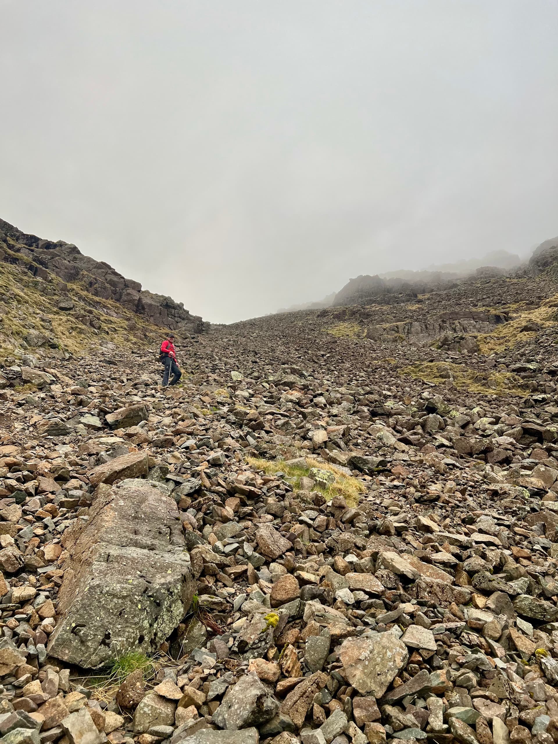 It was a long walk to Great Gable, some a little scrambly over wet ledges to keep us on our toes. On and on we went, past dogs and stoners, and eventually down below the cloud to see something again. This just meant it was time to climb back up.