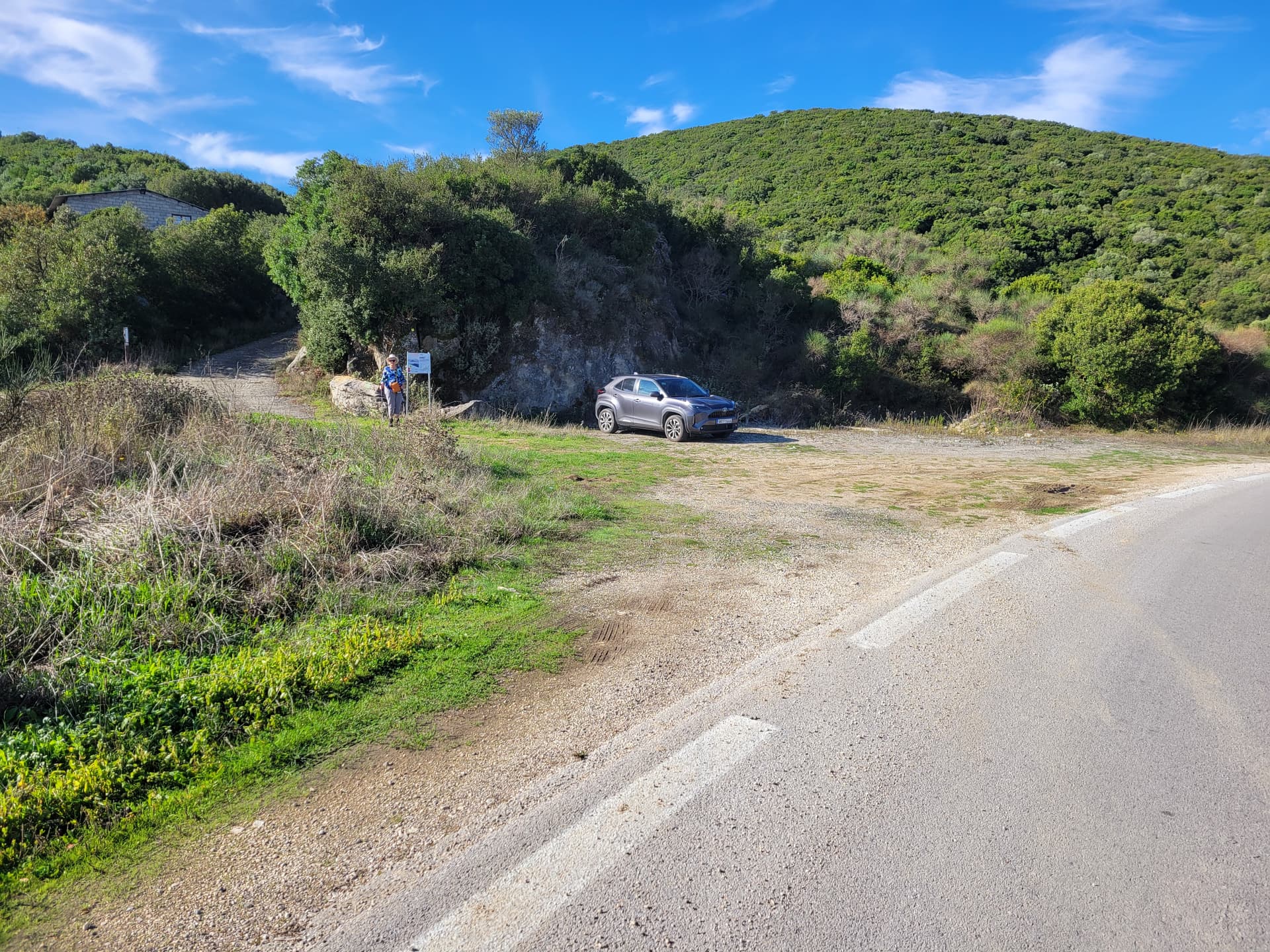 Indistinct path leaves here, the parking area entrance can just be seen about 50m away on the right side of the road.
