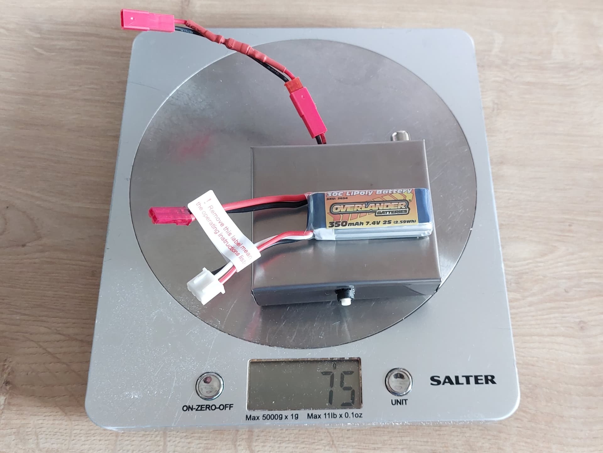 I’ve used PP3 batteries in the past, for the LA1KHA challenge, but these weigh in at >30g just by themselves. The USB rechargeable lithium 9v batteries aren’t any better. I decided upon a 350mAh 2S lipo, weighing around 18grams.