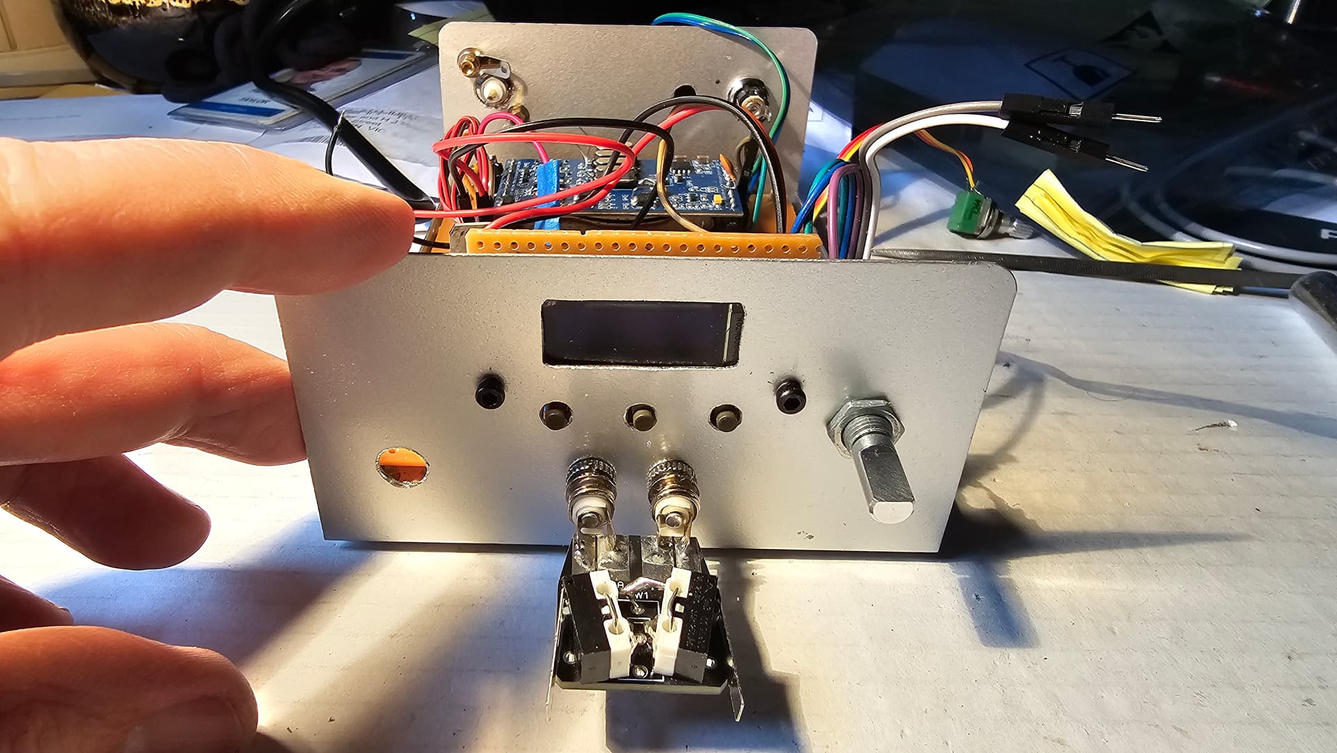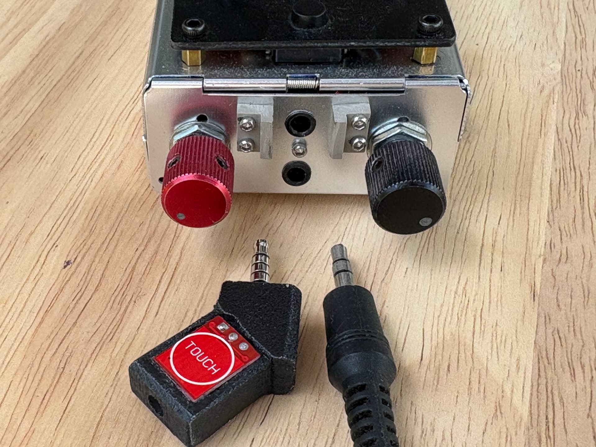 For my plug-in paddle I came up with two 3.5mm sockets side by side. Only one is needed but the two provide physical support for the paddle so there is no sideways movement. If you don’t have access to a 3D printer I think this is a simple and easily reproduced option. Ultimately I just want to eliminate the paddle lead for a compact txcvr that is hand-held (or held against a desk, rock or your knee). In my project I used one socket for paddle and the other for straight key. The paddle shown uses Jaycar micro-switches but a touch paddle can be substituted.