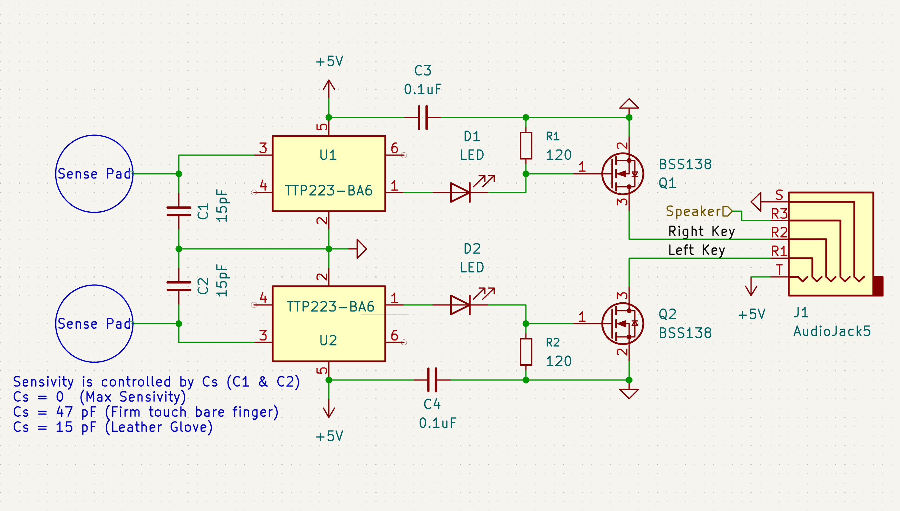 Very nice outcome, the paddle is a work of art by skilled artisan! Please allowing me to share my experience with my gloves friendly touch paddle, it is dirt cheap to build with TTP223 module and extra MosFet. I used high density foam for the paddle case with 5 pin audio plug for 5V supply, keys, speaker and ground.