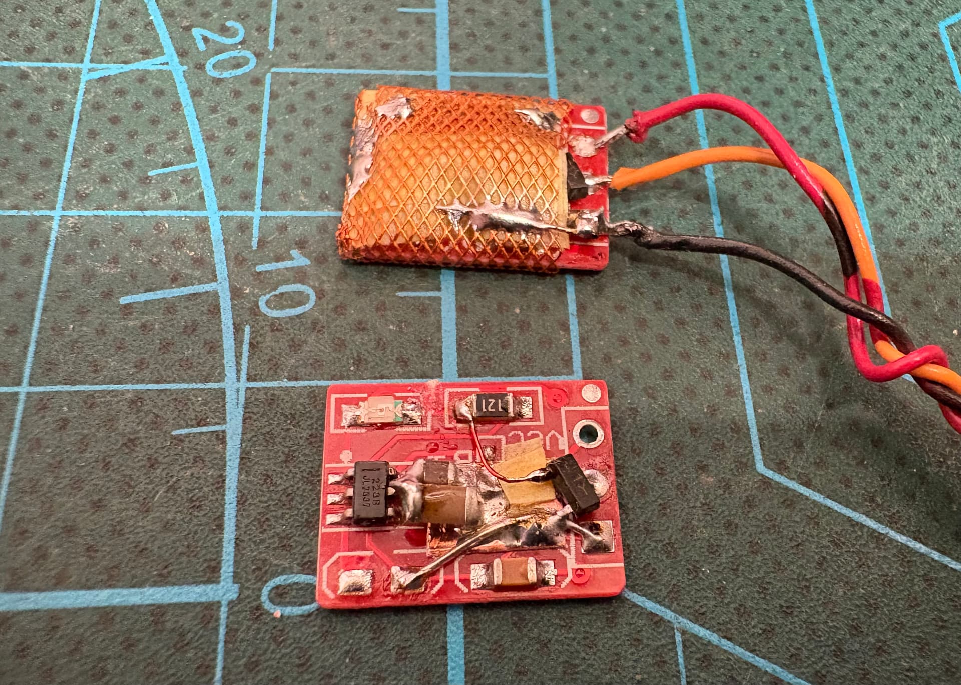 Cut 1 track according to the picture and soldering the BSS138 to the module terminals for Drain to I/O and Source to Ground. The Gate is linked to the 120 Ω resistor (SMD marked 121)