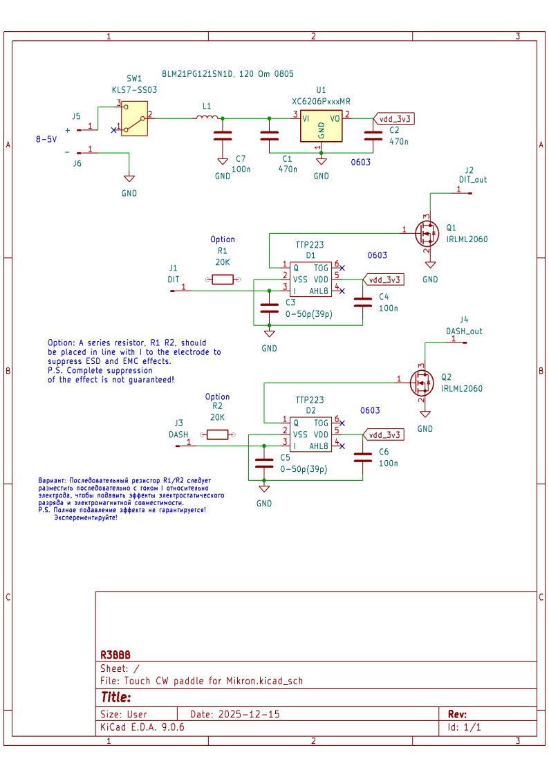 Hello. Regarding the sensor key, I liked the idea of a portable CW transmitter and decided to build one out of a USDX-Mikron. For ease of use, I decided to equip the transmitter with sensor contacts. I couldn’t find much information on this topic and decided to build it intuitively. The result is an EMI-resistant design with three levels of protection.Additionally, a current balun was installed after the tuner. Easily accessible components were used. Tested on various antenna types, shortened and full-size, and at various frequencies, no operational errors were found.