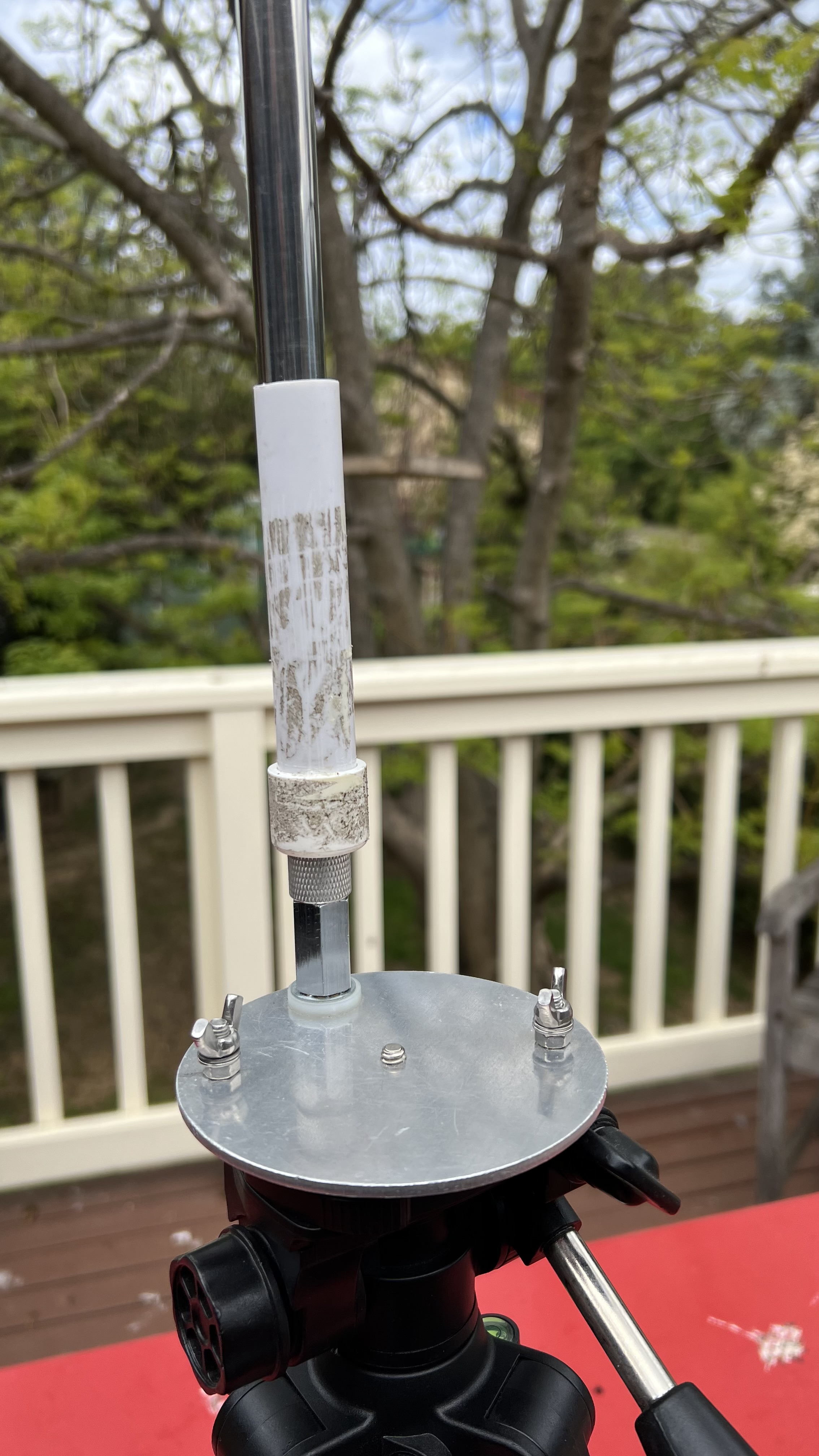 My version of the 20m GP, 5 metre stainless steel whip and tripod base. We may have similar construction techniques. The four elevated wire radials are secured to the aluminium disc by two M5 thumbscrews.