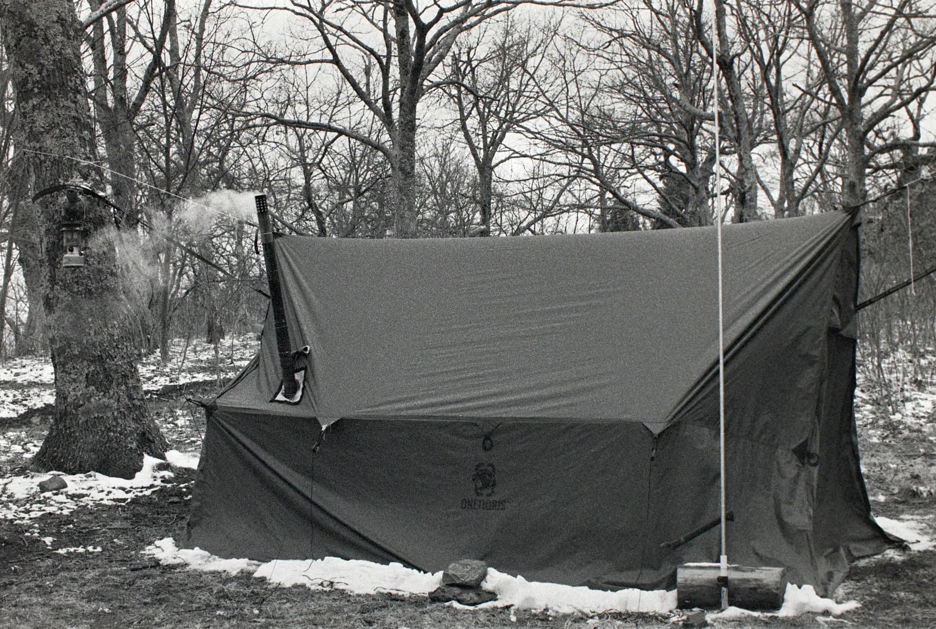 Here’s a pic I took of my tent (hammock with wood stove) on top of Flagpole Knob (W4V/HB-003) last year during a winter activation (you can see my vertical antenna right in front of the tent). This was shot using my F-1 and 50/1.4 lens. Film was probably Bergger Pancro developed by me in LegacyPro L110 (HC-110 clone) and scanned with my M43 camera: