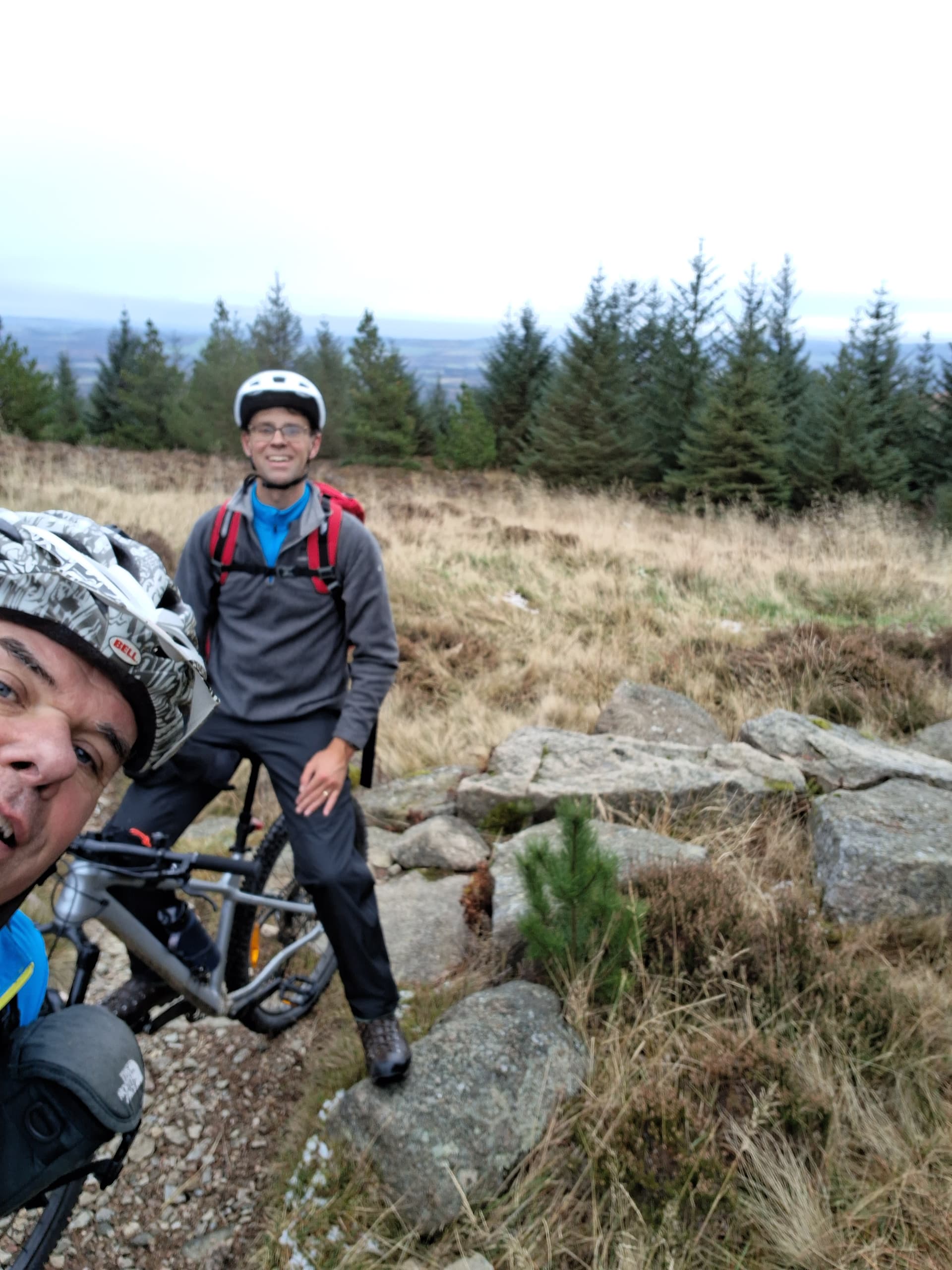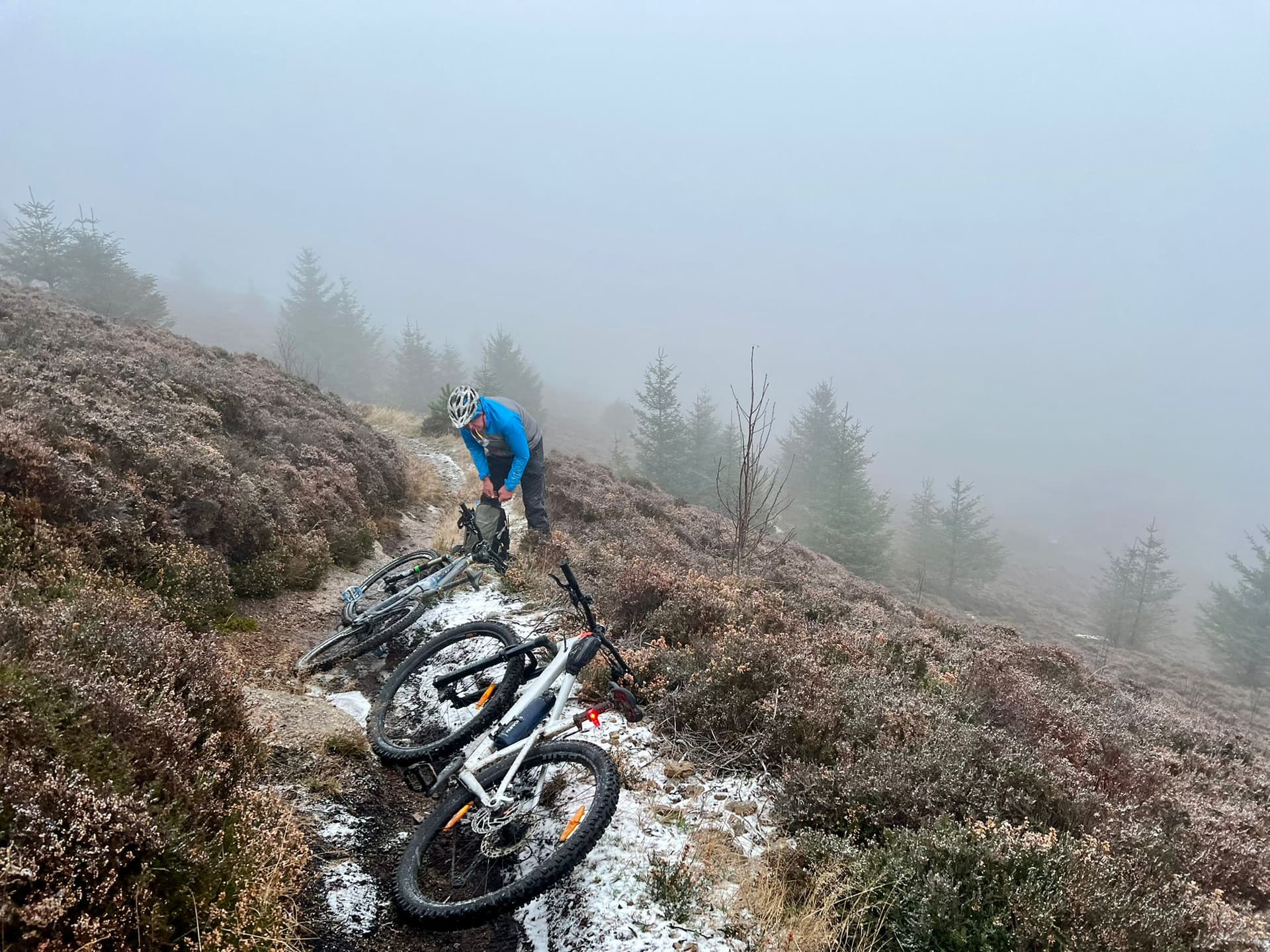 At the end of the single track, we re-joined flowing forest roads that took us back to the car park. Unfortunately they flowed up and down as well. The hill snow was falling as sleet further down and the roads were pretty wet by now, so we arrived looking like a right couple of mucky mountain bikers. Those of a nervous disposition look away now.