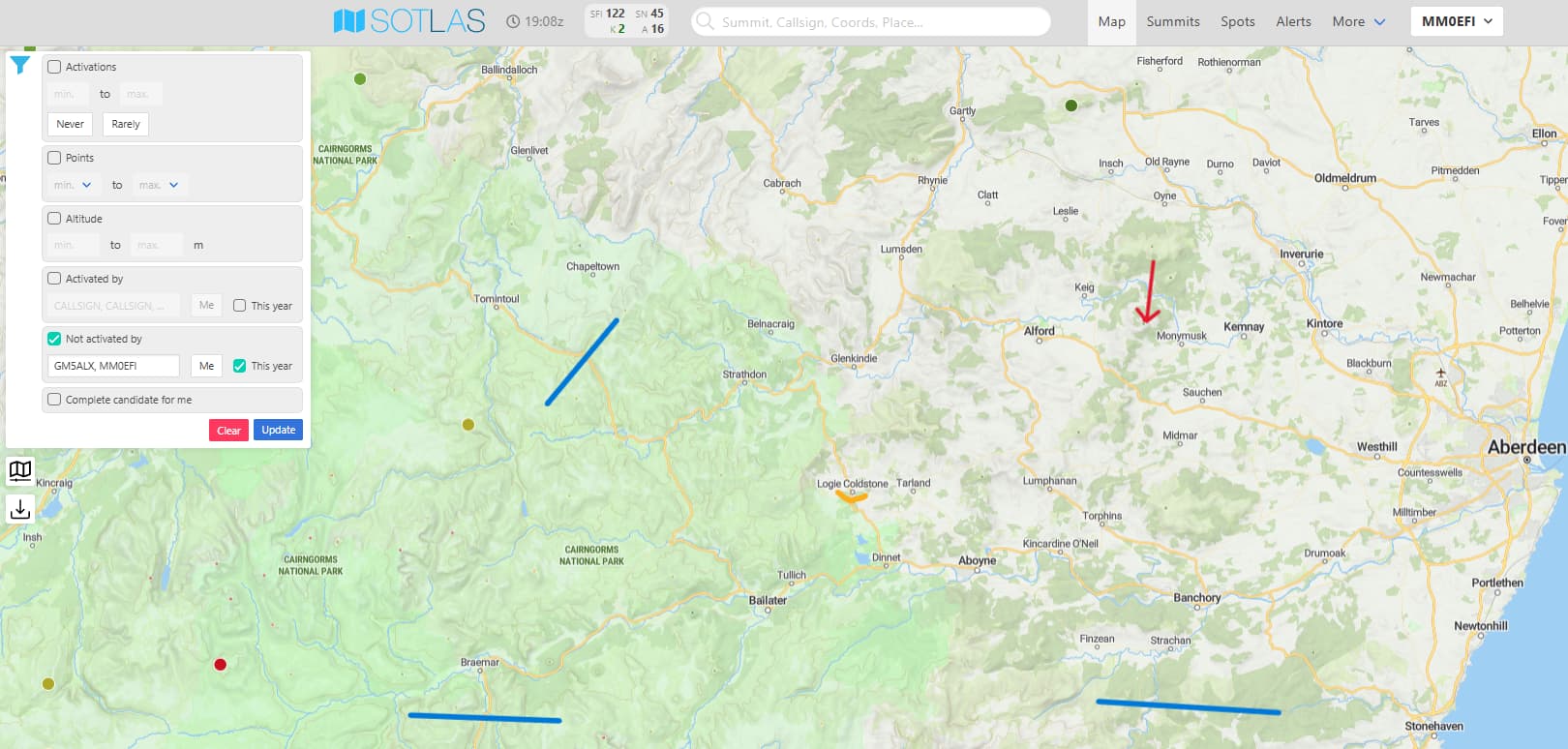 there would be around 70 summits if this wasn’t filtered. Blue lines are snow gates. Red arrow is Cairn William (map created after log upload, so it has also disappeared)