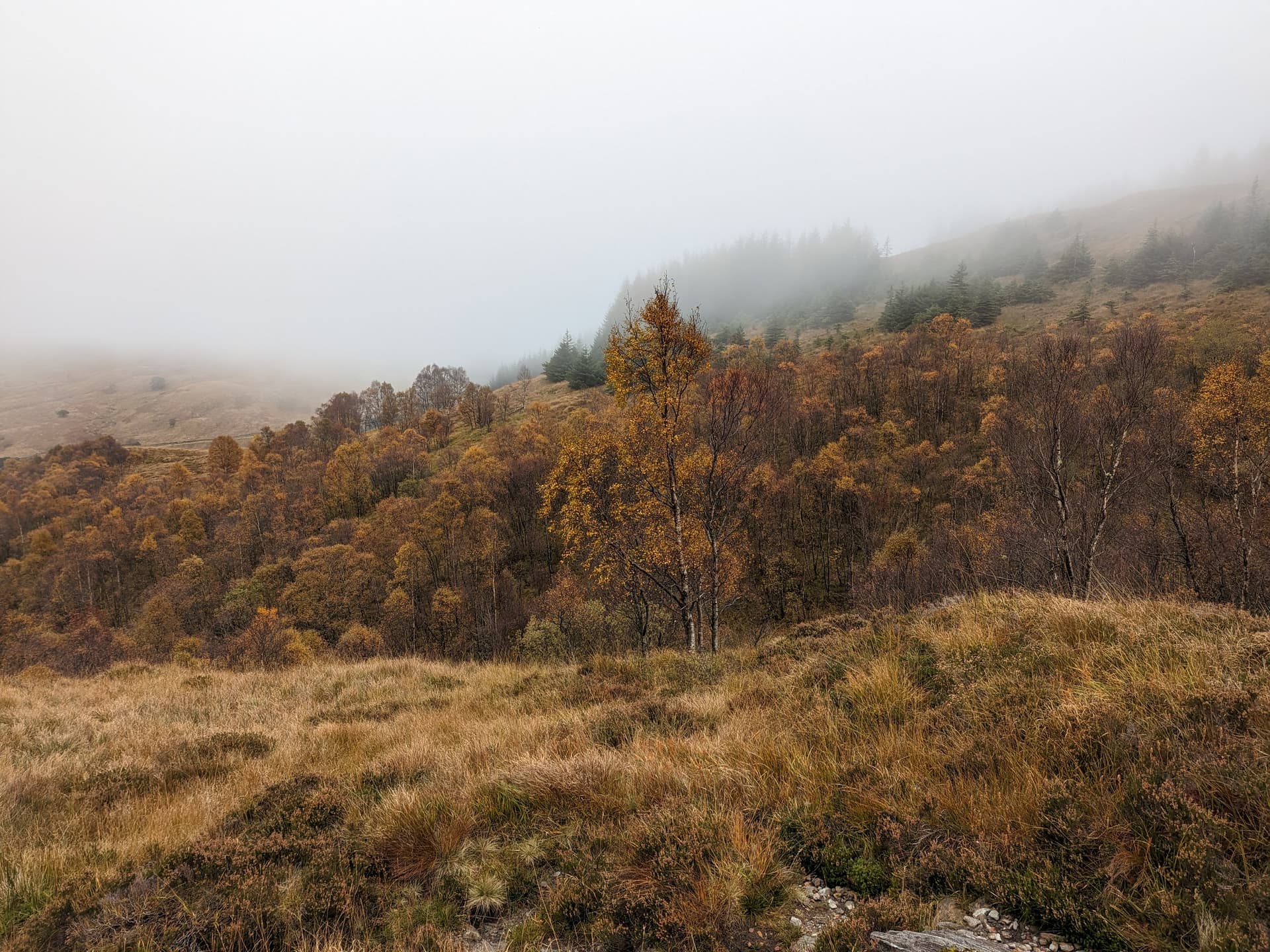 I’d managed to get just above the mist line to camp, but it followed me up the hill during the night so Tuesday dawned grey.