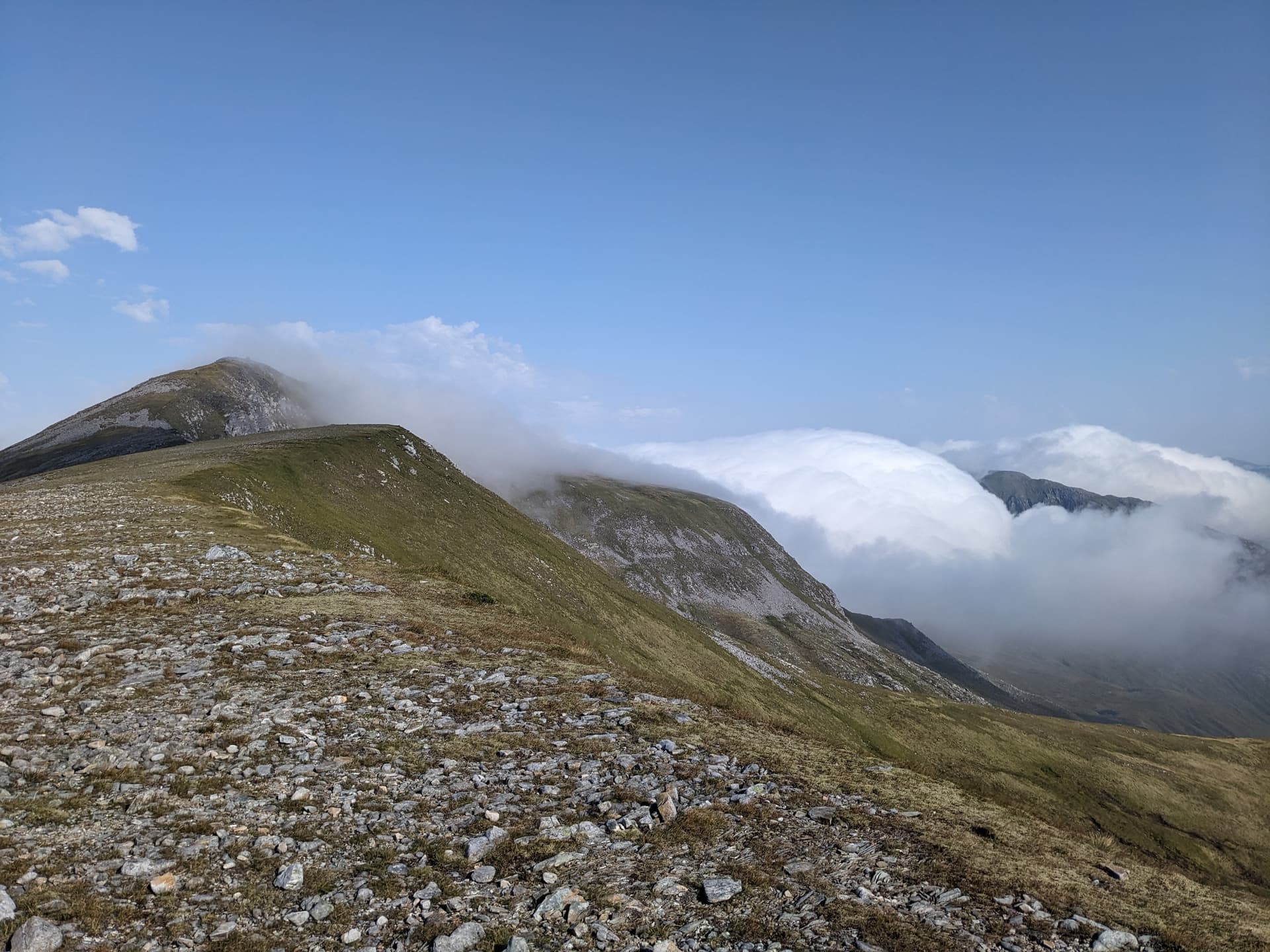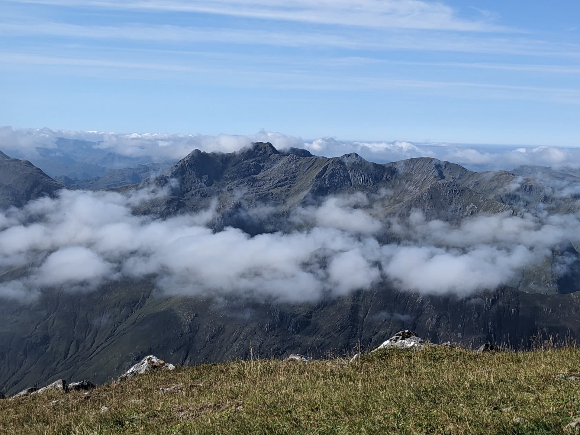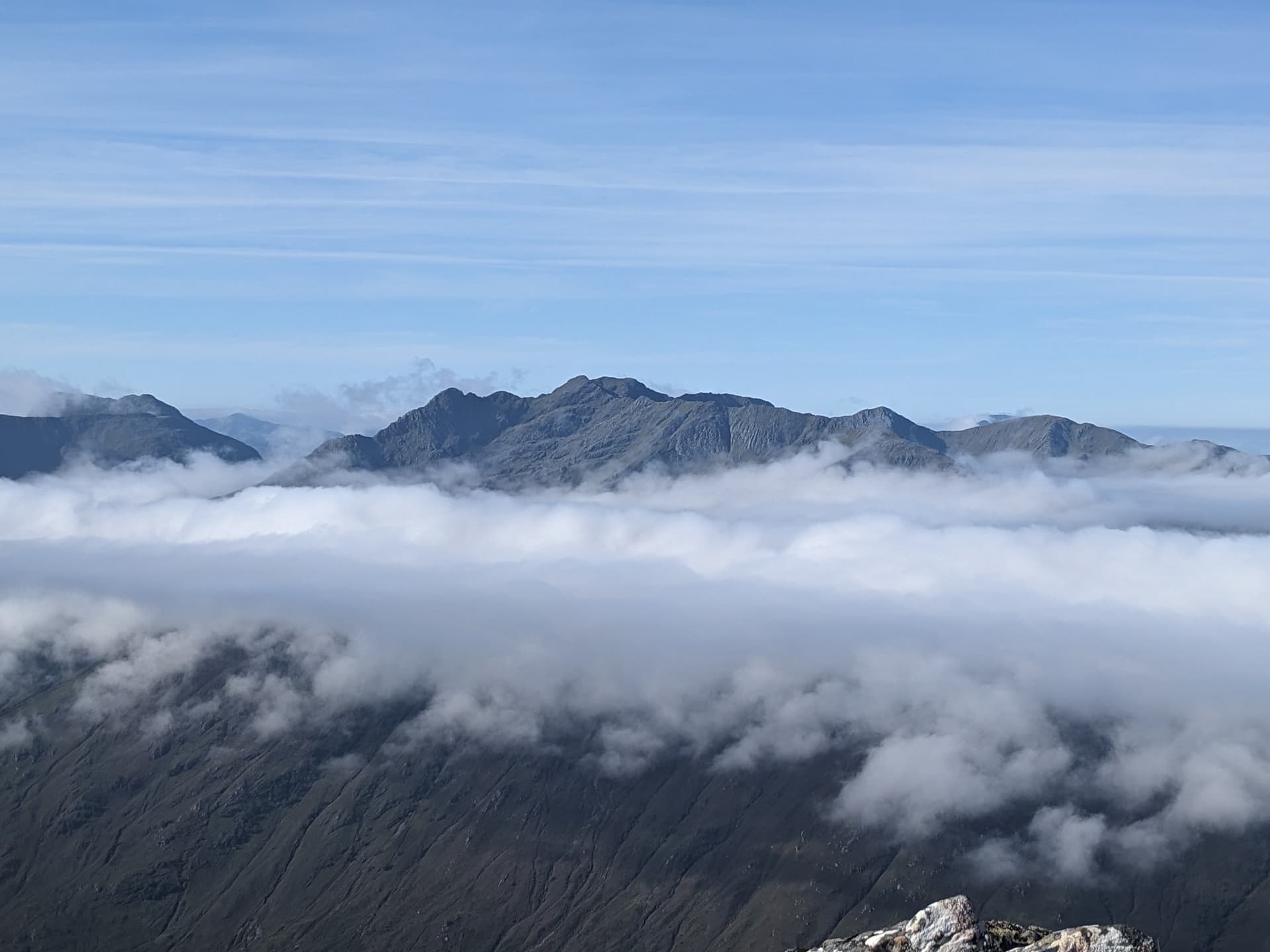 On the the next summit (middle of the ridge) and met a lady and her son going the other direction - we’d briefly spoken in the morning when I was parking the pushbike for the (downhill) cycle back to the car. We were commenting on the beautiful views - The Black Cuillin showing up above the clouds, then she started reeling off what we were looking at and we were seeing a long way! Rhum Cuillin, Skye Cuillin, Liathach, Beinn Alligin, Nevis and the Anochs in the other direction - just ridges and ridges of hills… my brain was in overload with views by then…