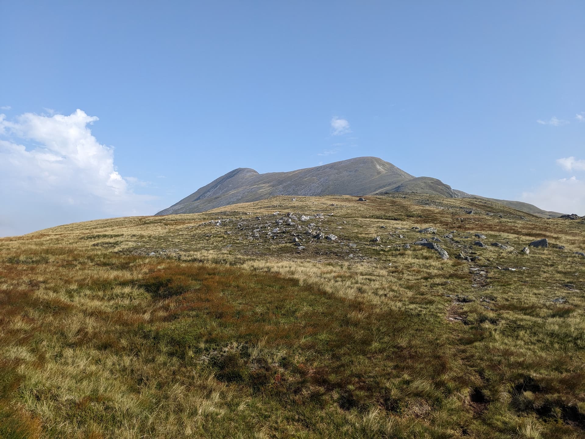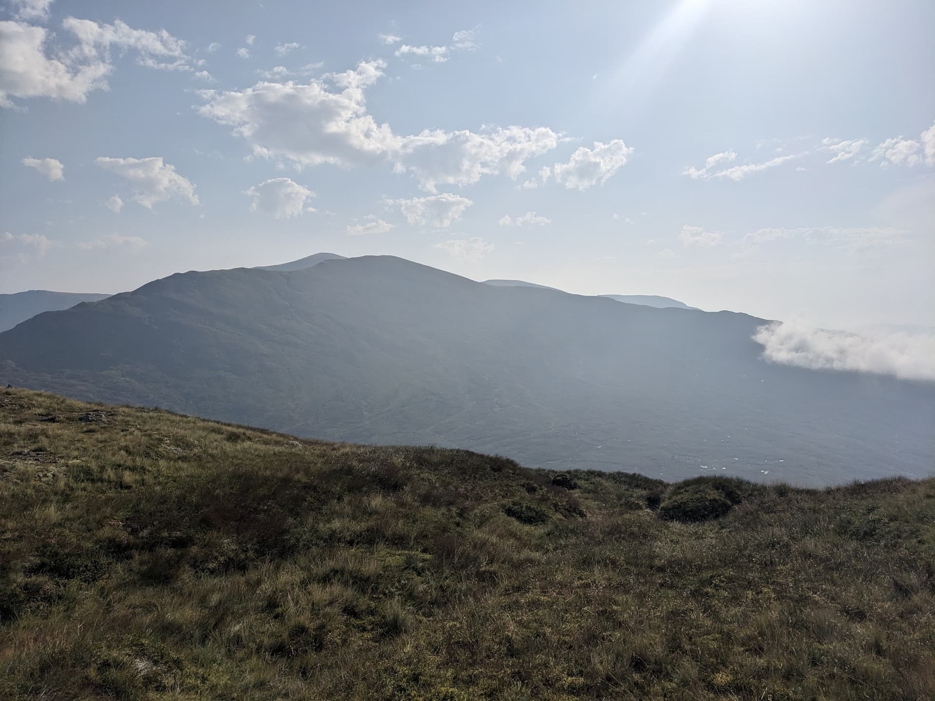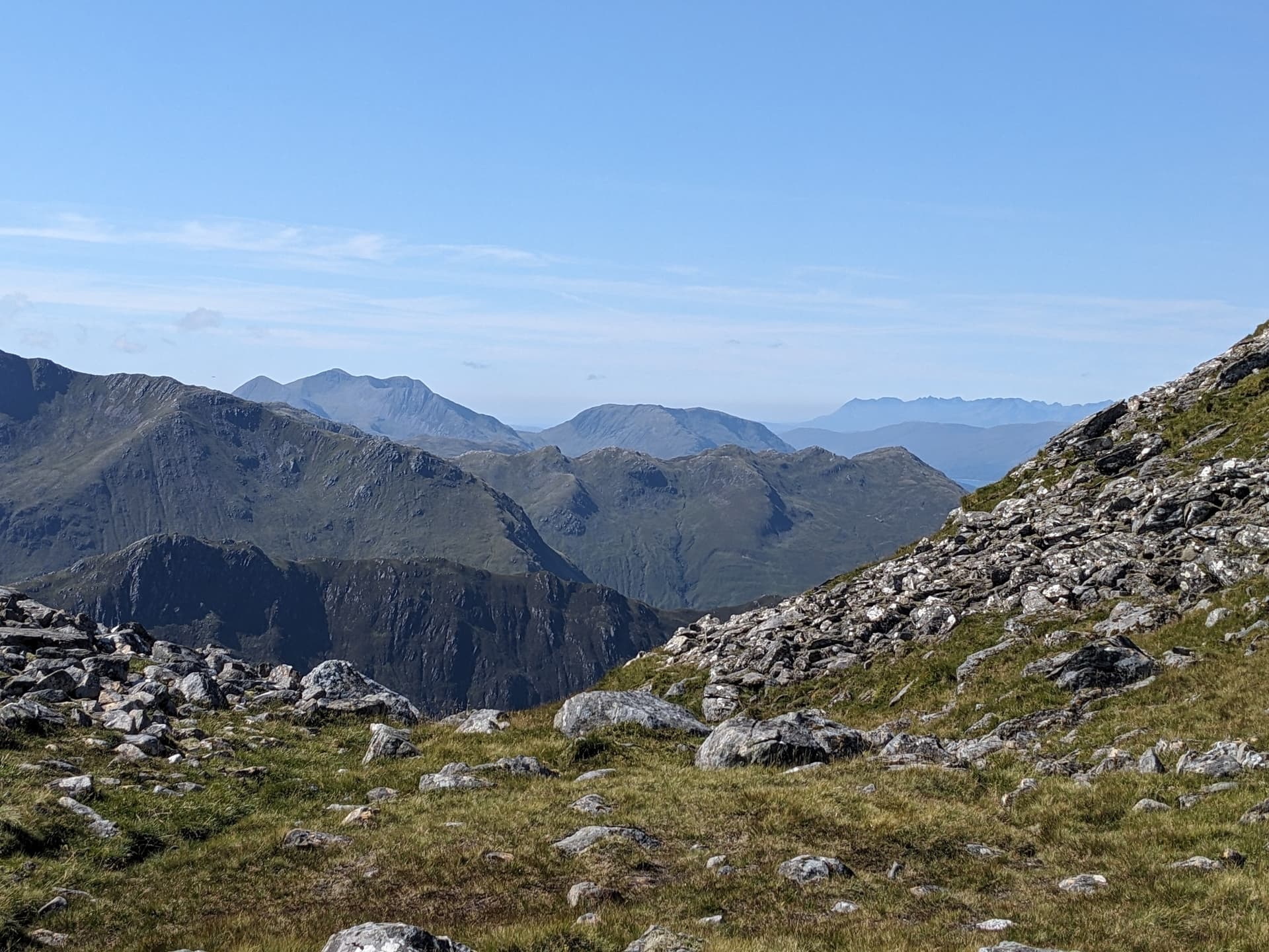 On the the next summit (middle of the ridge) and met a lady and her son going the other direction - we’d briefly spoken in the morning when I was parking the pushbike for the (downhill) cycle back to the car. We were commenting on the beautiful views - The Black Cuillin showing up above the clouds, then she started reeling off what we were looking at and we were seeing a long way! Rhum Cuillin, Skye Cuillin, Liathach, Beinn Alligin, Nevis and the Anochs in the other direction - just ridges and ridges of hills… my brain was in overload with views by then…