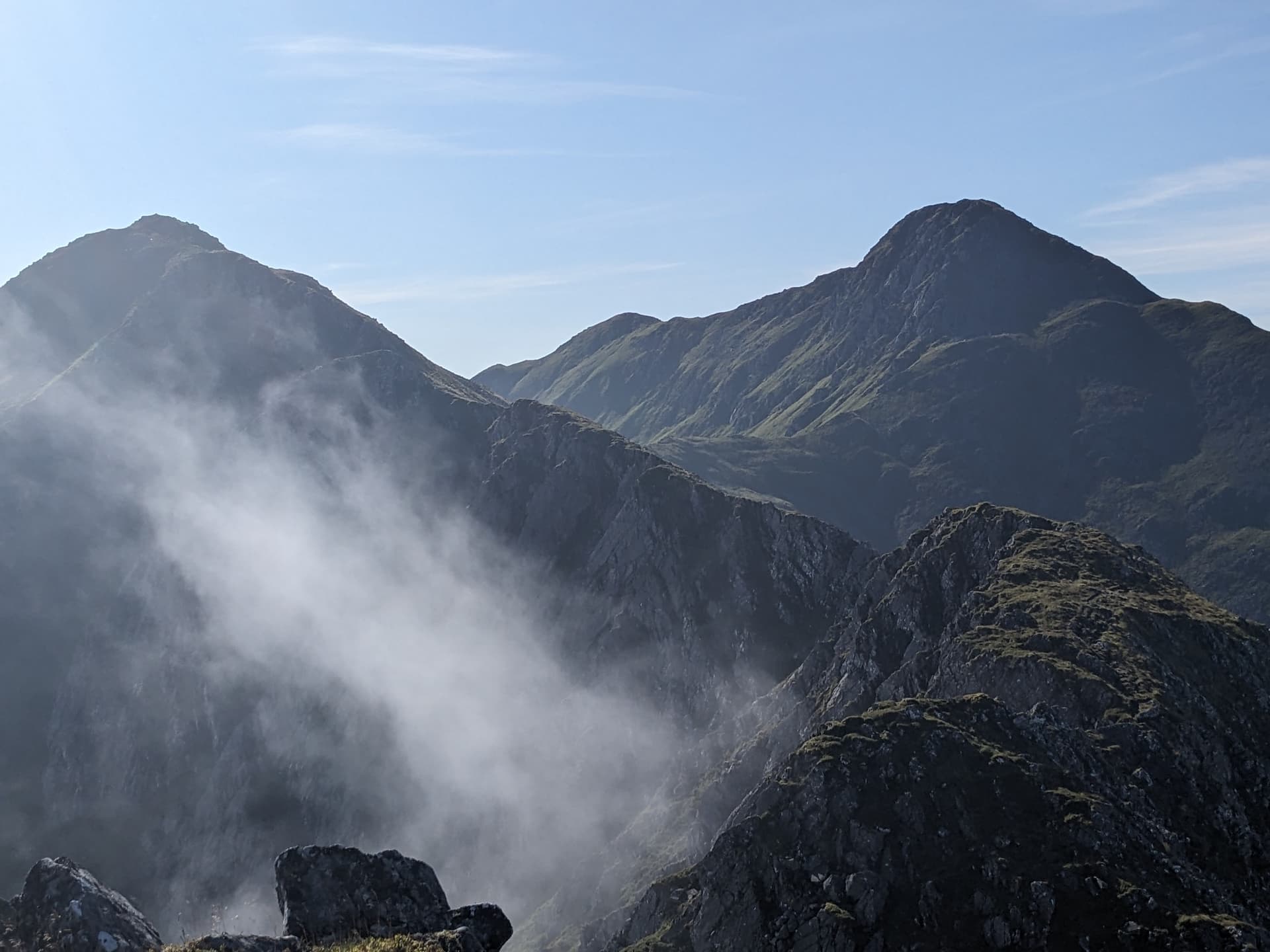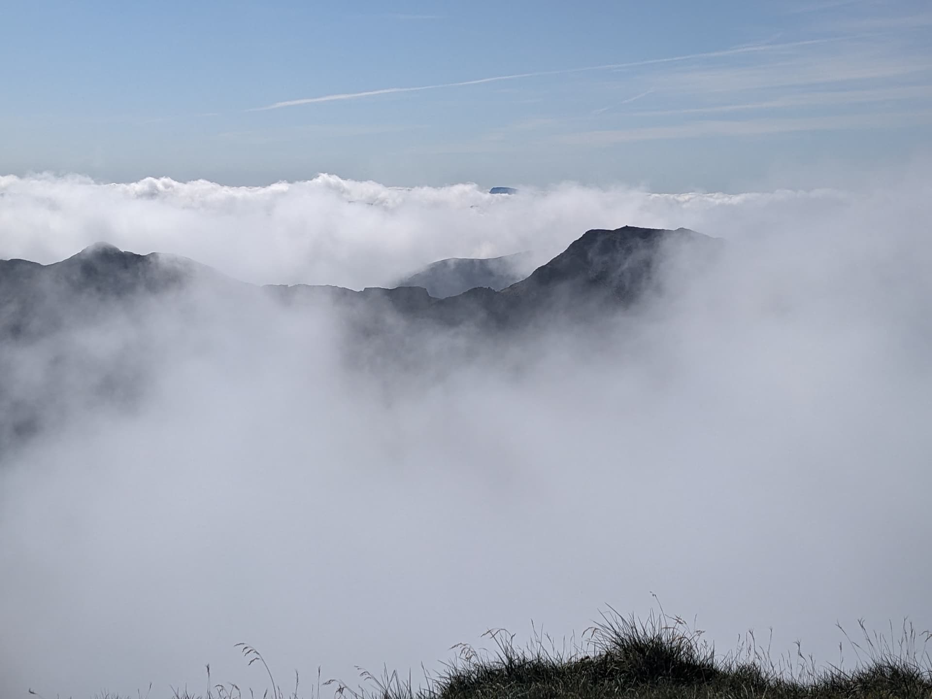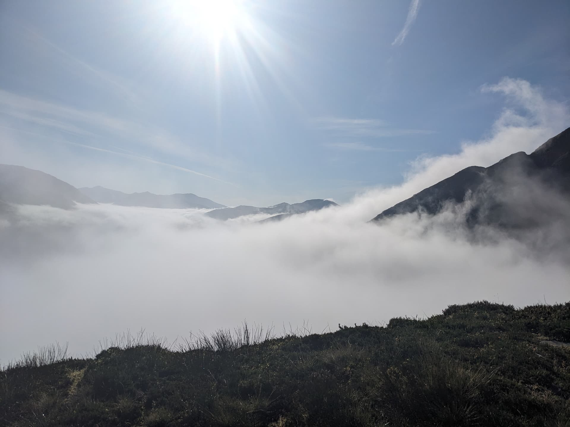 5:30am some neighbours were breaking camp… I peaked out the tent and there was fog at about 100 height - groan… however I noticed a short time later that it was variable and the met office mountain weather forecast was still for clear on top, so off I went. Today’s targets were the 2 Sota peaks on the “5 Sisters” ridge @GM/WS-027 and @GM/WS-041 - the trouble(!) with them is that at >1000m and in the middle of a ridge of similar heights and involving scrambling, they are not easy conquests… there is no easy way off mid ridge either, so you are in for the duration!