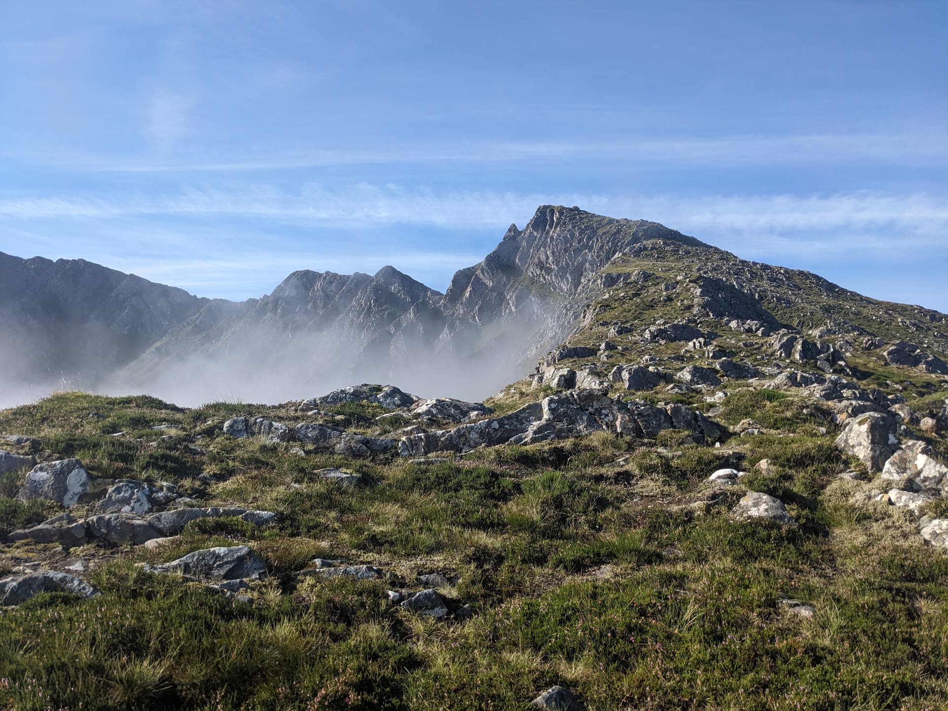 Thursday dawned per forecast, with some hill fog around. The day’s targets were A’Chralaig (The Basket) GM/WS-014 and it’s neighbour Mullach Fraoch-choire GM/WS-018, the two being joined with a ridge which has “spikes” - fortunately those can be avoided by bypass routes. Fog was billowing around all the adjacent hills other than A’Chralaig which was odd, but nice! The ascent is an unrelenting slope up to about 700m then a slightly more gentle rise to the summit. Last year was very windy and snow on the slope. This year was very sheltered (little wind anyway) and very hot!! As I worked up to the summit, the neighbours would show themselves occasionally and then disappear. I got set up in sunshine and activated - no-one else appeared there. The radio was tricky - with strange conditions. Very welcome contacts to The Hebrides - Seamus in Lewis was super strong and a great help over following days too. I had a couple of contacts on 2m and then on to try HF - lots of crashes and bangs suggested thundery weather around so I didn’t hang around too long - the air went funny smelling too.