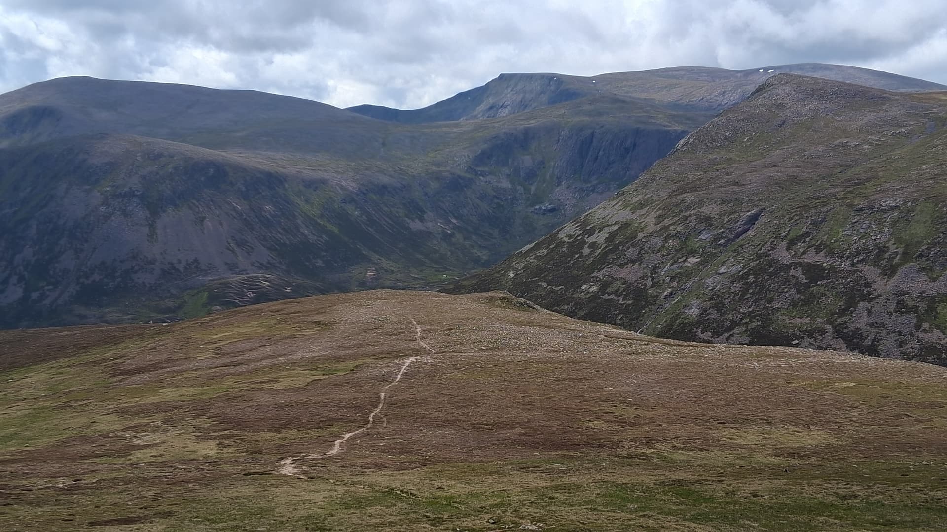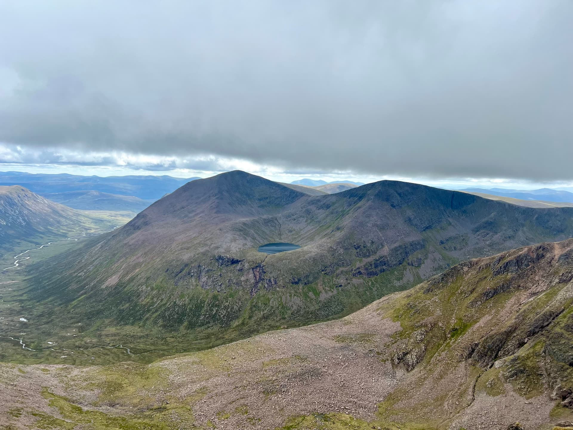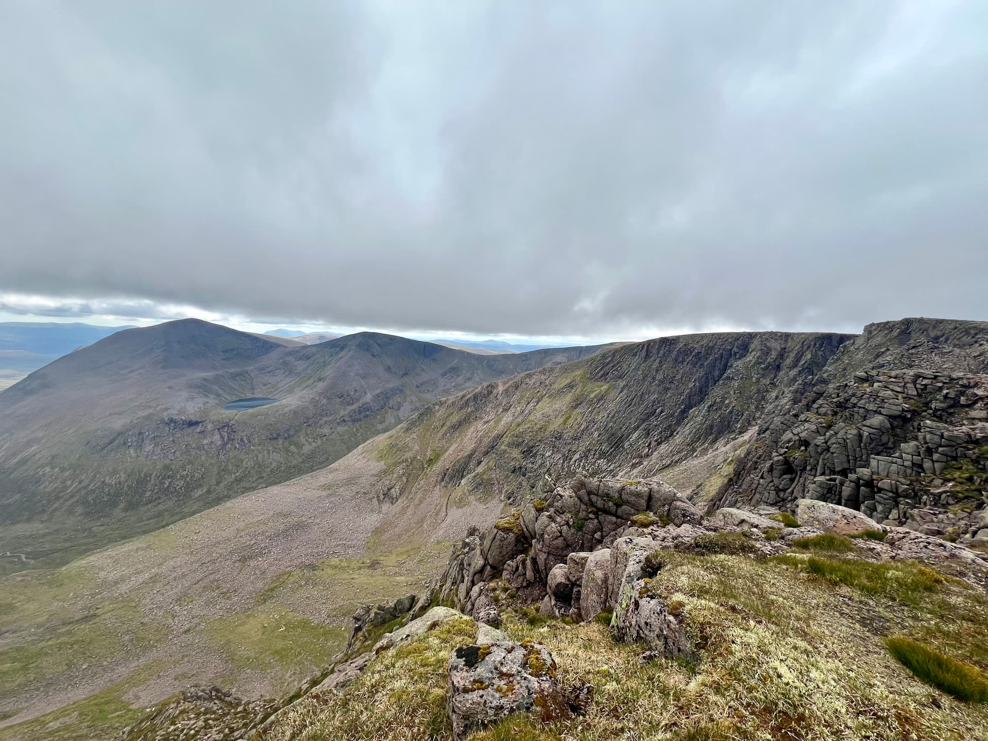 From the top and start of the descent of Bynack More, Creag Mhor looks tiny! A tiny 895m summit! Can also see the remains from the Multi-Troop Transport during the filming of the Clone Wars.