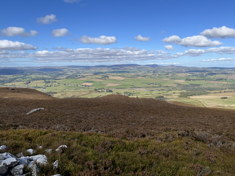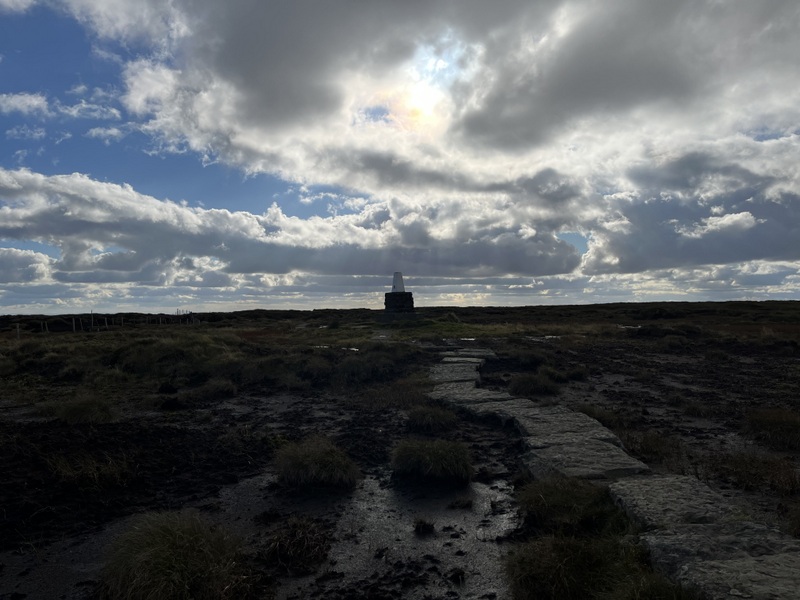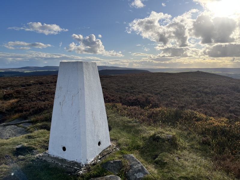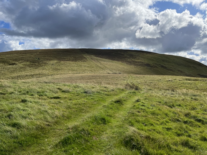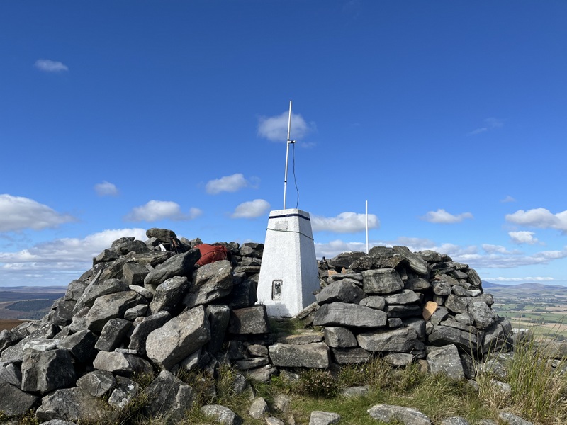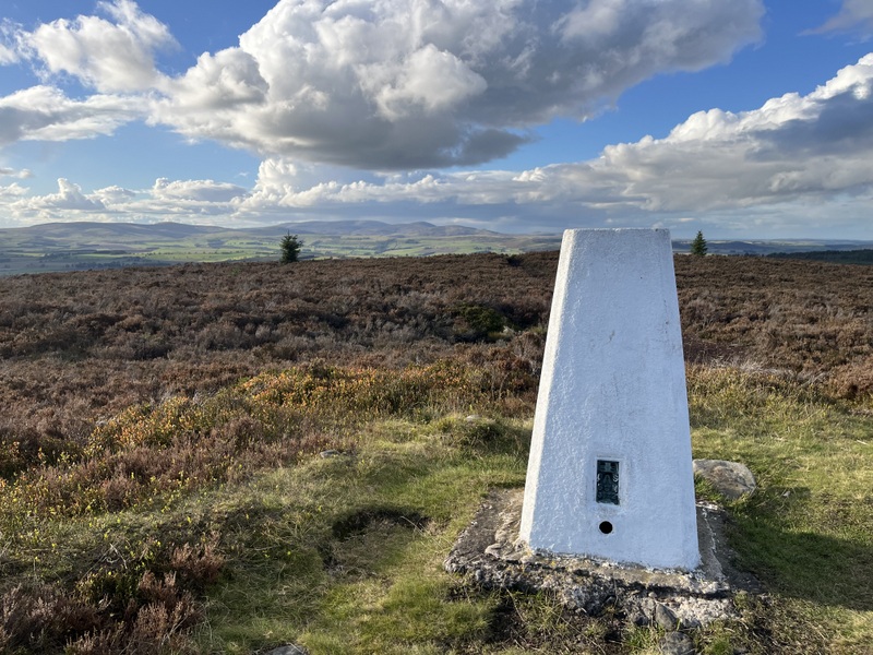 Our late start meant we weren’t walking until 11:45 – over the footbridge for what turned out to be the muddiest part of the walk up to a gate on the other side of the valley. The footpath running along the side of the valley had a variety of fungi before joining a bridleway above Barrowburn. We left the bridleway to ascend on a grassy track which curved back south to ascend to summit – with several stops to take in the views. We reached the white painted trig at 12:35. It is surrounded by a low shelter which didn’t offer much wind protection.