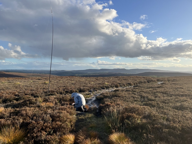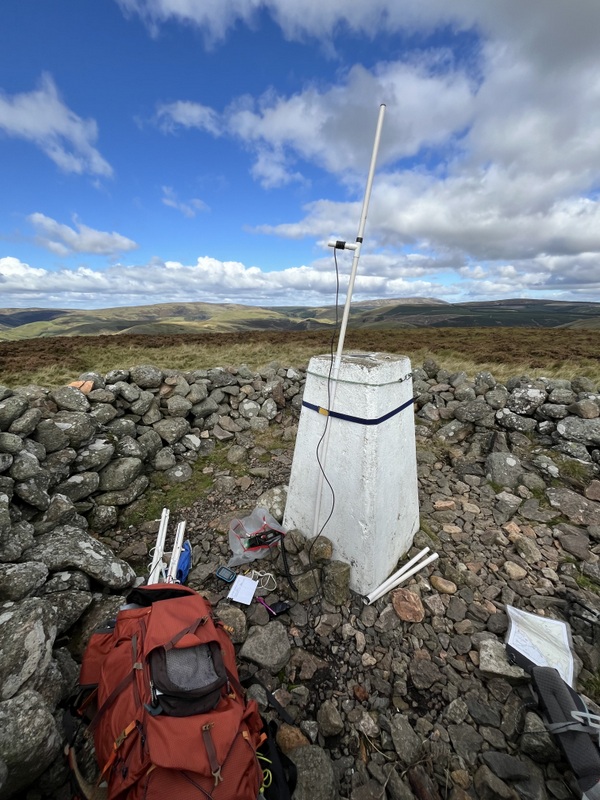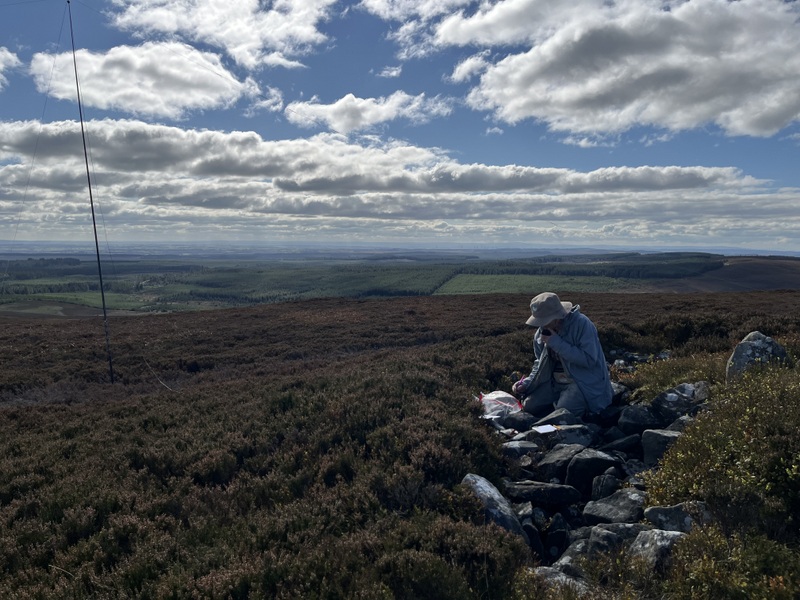Since it seemed a quiet area, Caroline set up inside the shelter, lashing the VHF antenna to the trig point, while Martyn was on the outside of the shelter with the HF antenna in the low grassy heather. Caroline struggled on VHF – there are larger hills in several directions – getting just two 2m contacts with relatively poor reports. Martyn did better on 60m so after he had qualified with 5 contacts, he handed HF over to Caroline for a run of 13 on 40m, including an S2S with M0LZN on G/NP-028 which Martyn also managed – though he had been having a rag chew on 2m FM with one of Caroline’s earlier contacts. We decided that with lunch eaten we needed to descend if we were going to have time do another hill, but then noticed a 20m spot for OY/WN2G on OY/OY-100, and we could hear him even with the links set to 40m, so a quick change of links and we both had an S2S with the Faroes.