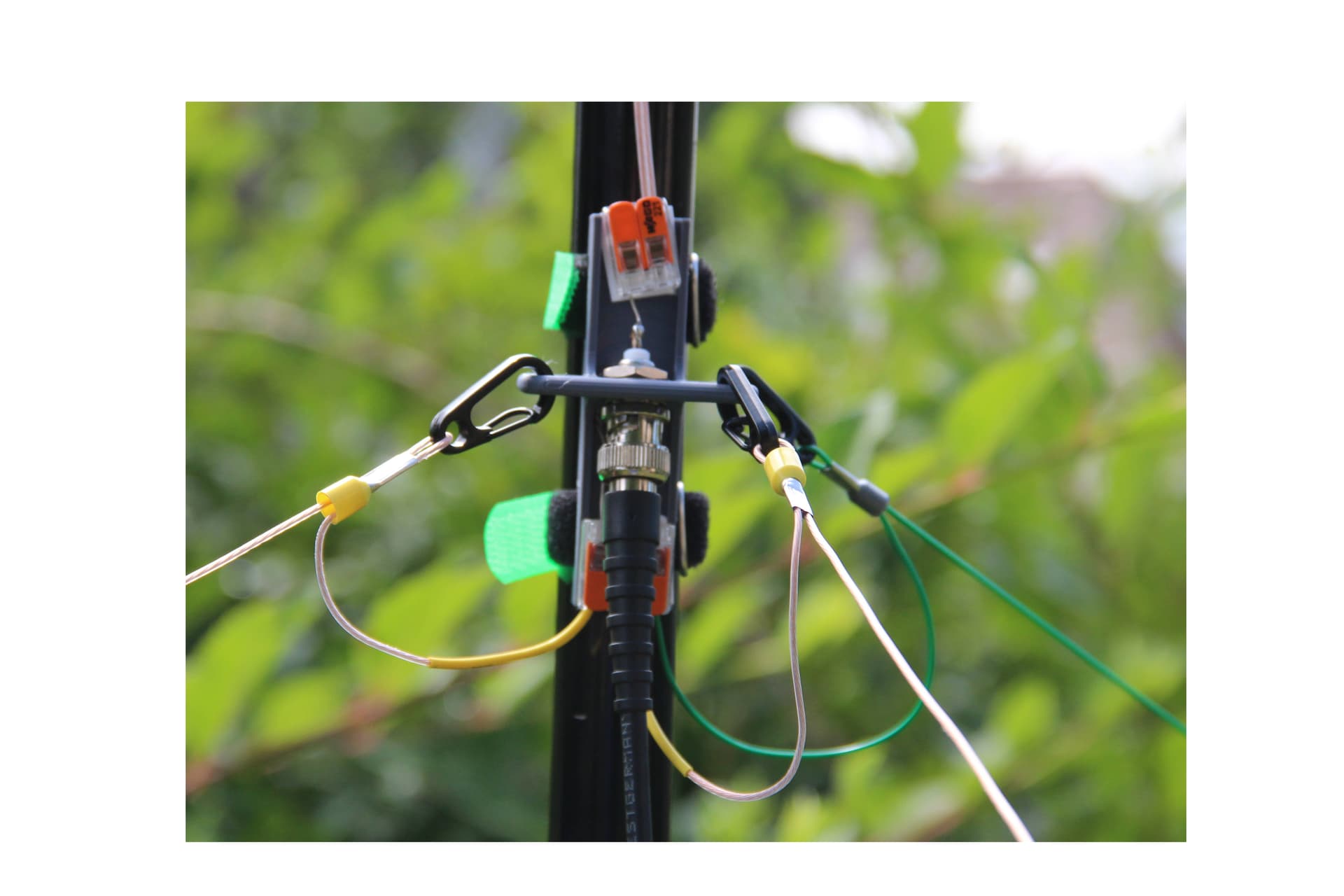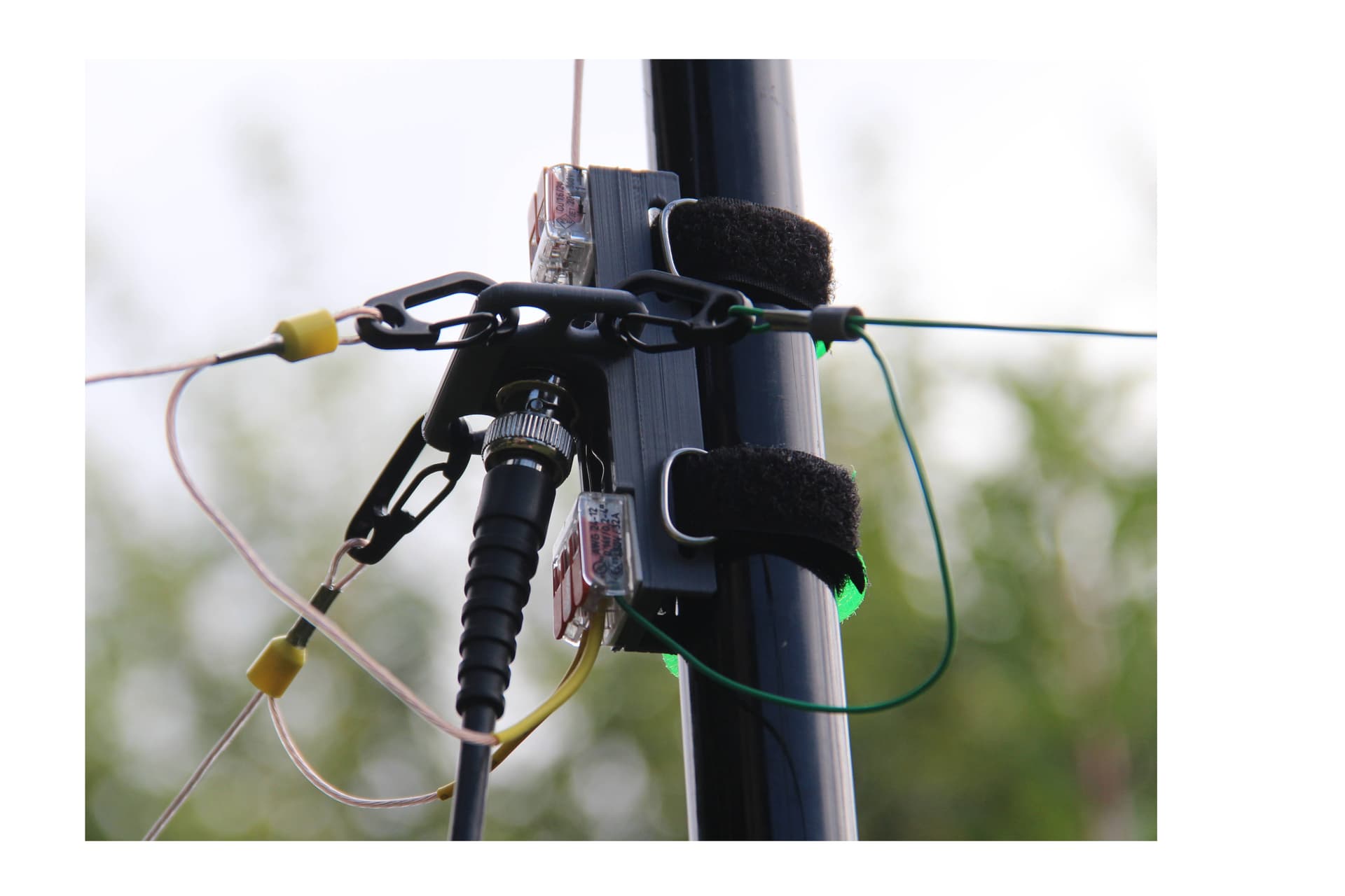 As an obsessed 3D designer, I built a custom centerpiece that holds a BNC jack and uses two WAGO clamps, one for the radiator and one for the radials. It attaches to a telescoping pole using two Velcro straps. This setup requires no tools and avoids small, easy-to-lose parts during field use. I’m curious how others have approached this. The radial connections are strong enough to act as guy wires and support the mast upright.