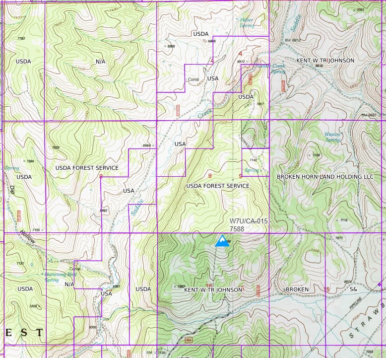 Another example: Within the Cache National Forest, there are numerous private land parcels, or “in-holdings,” which include ranches or leased lands. Unforunatly, there seems to be a changing iterpretation of trial usage in some of these areas. Please refer to the map below for details around CA-015. Albiet this is a public peak in a Nationl Forest there may not be a way to access it. Key: Roads marked in Yellow indicate “No Trespassing,” and Red denotes trails or roads blocked with signage. Historically, I’ve been to the top of W7U-ca15 but canceled this trip as well. I didn’t drive the road to the west as it thus I don’t know if it was marked as “NO Tresspassing” See Second map. After analyzing the area’s parcel data, it is likely that a route exists to reach the peak’s parameters for SOTA; however, due to current access tensions, it is not advisable. There is no cellular covage in that area.